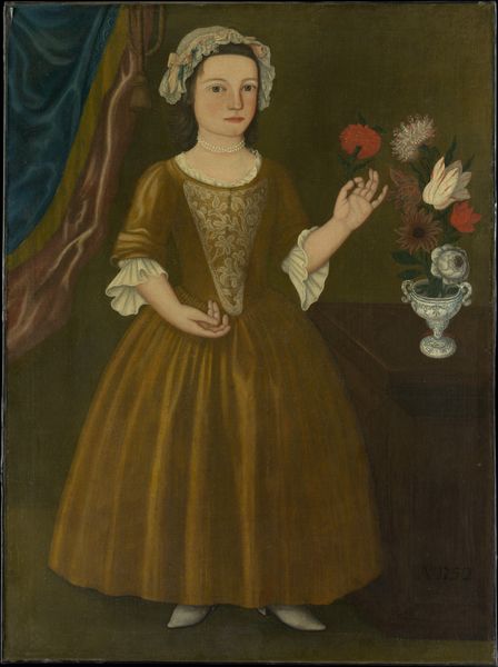 Curator: William Matthew Prior, around 1845, gifted us with this touching scene called "Baby in Blue". I find it utterly charming, but what is your initial read of it? Editor: Immediately, it whispers of the fragility of childhood, doesn't it? The slightly haunting stare juxtaposed with this vibrant dress, almost aggressively blue. Curator: Yes, and look at the meticulous detailing of the dress; it tells a story of labor, doesn’t it? This wasn’t some off-the-rack frock. Consider the unseen hands that stitched this garment, perhaps a mother ensuring her child’s visible social standing. The blue dye itself would have been quite valuable, emphasizing this point. Editor: Oh, absolutely. But the symbolism, it’s thick! That small cat perched upon a book-- knowledge, perhaps tamed, made playful. Or the loose spool of thread! Is this childhood coming undone, ever so delicately? Curator: That interpretation beautifully balances material realities with allegorical intent. The raw materials – oil paint on canvas – combined with Prior’s artistic labor created something layered. His folk art style catered to a rising middle class who sought accessible and relatable imagery. Editor: Folk art indeed, untamed by academic polish, brimming with sincerity! That direct gaze pulls you in. But it makes me question—was it an act of pure devotion, or was the work intended to advertise the wealth and status of this family? Curator: In that era, and with that level of material specificity, it's almost certainly a fusion of both. The child’s portrait commemorates their existence, but within a framework of clear class markers displayed through meticulous materiality. This object *is* meaning. Editor: A complex, painterly document filled with so many emotions! Thank you. Curator: Indeed. This little glimpse into a world past reminds us that every material tells a human story.