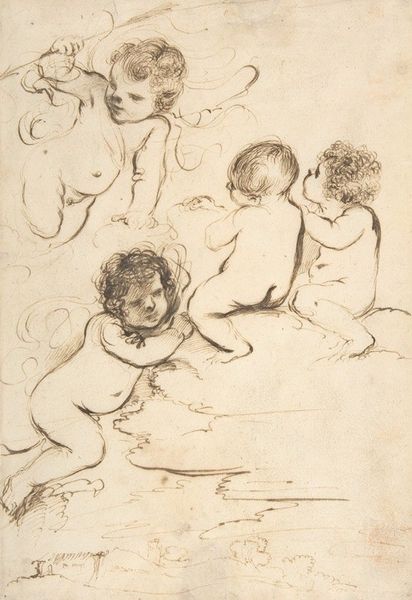 Curator: Let’s turn our attention to a study by Józef Simmler, from 1864, titled 'Sketches of Angels for the painting "The Immaculate Conception".' It’s rendered in pencil. Editor: My first impression is one of incredible tenderness. The softness of the pencil work really captures the innocence and vulnerability of these youthful figures. You can almost feel the fragility of the paper beneath. Curator: Indeed. These aren't just studies of figures, they're studies of ideas about innocence and divinity made manifest through childhood. The cherubic faces, the unclothed forms—it all contributes to an archetypal image of angels as pure, uncorrupted beings. We see artistic depictions of innocence here that resonate culturally and psychologically. Editor: Right. And consider the act of sketching itself – a direct, unmediated connection between the artist's hand and the paper. You can see the artist working through the composition, testing different poses. This is labor, you can really feel the hand of the artist at work in this piece. Curator: And this work sits within a long history. Think of Renaissance masters using studies to work through complex theological ideas, using line to portray ideal forms. There is a spiritual intention, aiming to provoke contemplation through the visual language of angels as messengers between heaven and earth. Editor: It makes me think about the economy of art materials. Simmler chooses pencil – an accessible, relatively inexpensive medium for these explorations. The use of humble material lends a degree of humility to this theological project. He is representing heavenly beings but relying on earthly and accessible supplies. Curator: Ultimately, this work asks us to consider how our understanding of the divine has been shaped by artists who return again and again to specific, familiar images of youthful, androgynous figures. Editor: Yes, this image of angels also suggests a particular context of artistic training and craft in the nineteenth century – and what materials, labor, and the artist were considered. Curator: Absolutely. These sketches speak volumes, both about Simmler's creative process and the enduring power of symbolic imagery. Editor: I'll definitely look at Simmler's process differently now. It is also incredible that the image remains both very temporal, linked with material culture, and timeless.