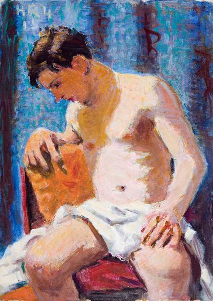 Editor: So, this is Denman Waldo Ross's "Portrait of a Young Man Holding a Bowl," painted with oil on canvas. It feels like an intimate, almost unfinished sketch. What story do you think it's telling? Curator: I see a portrait brimming with potential narratives. The subject's partial nudity and the ambiguous bowl draw attention to themes of vulnerability and sustenance. Could the bowl symbolize privilege, or perhaps the expectation of service? How does the artist's gaze upon the subject reflect broader power dynamics of the time? Editor: That's a different reading than what I had. I was more focused on the composition, but I see your point. Curator: Consider also how Ross's aesthetic choices might mirror or challenge conventional portraiture, reflecting his own positioning within the artistic and social landscape. Editor: I'll definitely look at it with fresh eyes now, thinking about those power structures. Thanks! Curator: Indeed. Art invites these multilayered readings.