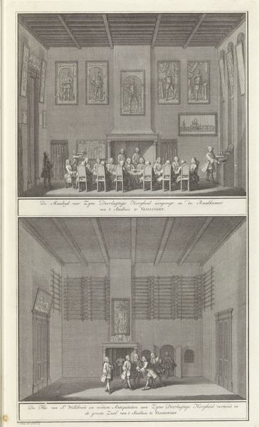 Curator: This engraving, dating from 1785, captures the drawing of the lottery by the Dutch East India Company, or VOC. Editor: The whole thing looks rather clinical, doesn't it? Stark. Lots of perpendicular lines. Yet, those turning lottery wheels filled with children also strike a whimsical note, don't they? The future and innocence are so intertwined. Curator: Precisely! Those wheels—cages, almost—are so central. The kids pull out the winning tickets. Note the sober onlookers. Each element has a powerful resonance when seen as a kind of theater of fortune. Editor: Fortunes built and lost. I see how the cityscape depicted behind them might act like a character, too. As if to say: here’s what’s at stake. Trade, empire, all dependent on this sort of random draw. Like life, really. Curator: The print is rendered with the detailed lines typical of Dutch Golden Age engraving, though it's toward the tail end. It is an important record. Consider the symbols—the orderly space versus the chaotic lottery; the standing men of commerce and authority over against the boys picking their pockets—it tells a complete, unnerving story. Editor: Makes you wonder how many hopeful eyes gazed at this very image back then, and what it really meant to their chances. It's like they’re buying into an ideal as much as buying tickets, and it's sold by having kids touching the 'draw.' The promise of good luck seems so manufactured—it's clever marketing even for that time! Curator: I am reminded now that engravings like these were widely circulated in newspapers, weren’t they? This specific image appeared in the "Mercurius," functioning like an early advertisement. Editor: Adds another layer of significance, doesn't it? Art as pure advertisement. A sign of its time, the way dreams get woven into the material fabric of a culture, bought and sold on repeat. And still a symbol for how little has changed after all. Curator: Thank you, for that refreshing dive into historical symbology; these layers often blur in our own reflections on modernity. Editor: Yes, well, seeing history reinterpreted keeps art a current force—always revealing.