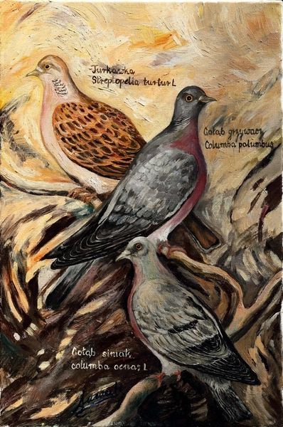 Curator: The painting before us is titled "Birds IV" by Małgorzata Serwatka. The medium appears to be oil on canvas, though it's interesting to note the somewhat indeterminate date. What strikes you first about it? Editor: Hmm, they feel like portraits of feathered nobility! The colors are quite muted and autumnal, and there's this stillness...like they're waiting to be set in motion, perhaps waiting to migrate. I feel a definite sense of latent energy there. Curator: You pick up on something intriguing. Birds often serve as potent symbols across cultures. They can represent freedom, the soul's journey, or act as messengers between different realms. Does this symbology connect with your first impression? Editor: Absolutely! The birds are rendered in such careful detail...with the almost ghostly strokes of their environment...but there is a contrast; they are rendered more solid, substantial almost more *real* than the grassy background they inhabit. It makes me think about seeing the birds not just as representative of a broader symbology but perhaps representing the individual among a backdrop. Do you agree? Curator: Yes, and there's more here as well. Considering the almost scientific precision in rendering the birds—note the textual notation of species present beside each avian portrait—it moves beyond mere freedom or the soul, delving into humanity’s scientific impulse. Perhaps this contrast that you notice emphasizes humankind's inclination to categorise what exists around us; this act of 'knowing' what a thing is. Editor: Fascinating... I get that, I really do. There's an undeniable tension in seeing both the artistic and almost academic at play here. Knowing this it really shifts the work from what felt like a romantic portrayal into something far more inquisitive, scientific, but the romance still manages to exist somehow! It has layers! What do you make of the artist leaving it without a determined date? Does this relate, in some way to those ever-present symbols that continue through time? Curator: A very astute observation. Not dating a work might suggest a desire for it to exist outside a fixed moment. By avoiding historical confinement, the work taps into something enduring, hinting at the continuous cultural significance of birds, of the natural world itself—themes that stretch far beyond any single time period. Editor: It's that continuous relevance that speaks volumes to me... "Birds IV" captures a quiet but eternal story! I will certainly leave today feeling more thoughtful. Thank you! Curator: Agreed. The confluence of realistic portrayal, scientific curiosity, and symbolic weight ensures it stays aloft in our considerations long after we move on.