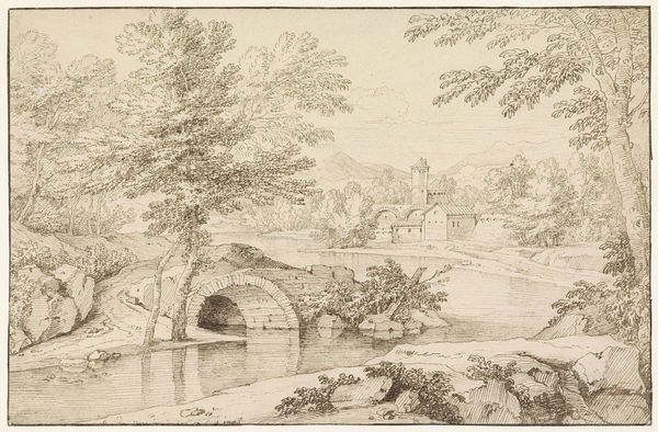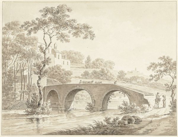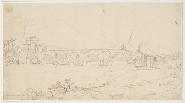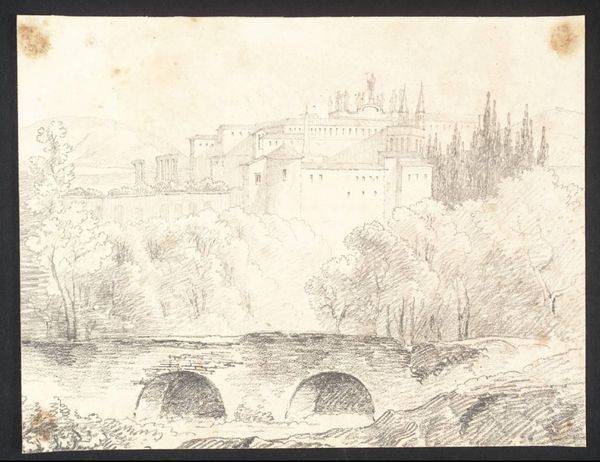 Curator: Oh, look! Thomas Girtin’s "Warwick Castle." It's undated, but housed right here at the Art Institute. Done with graphite, colored pencil, and perhaps a touch of graphite. A landscape drawing, very evocative, wouldn't you say? Editor: Evocative, yes, but initially melancholic. A grayscale daydream. The castle looms in the background, accessible by bridge... leading the eye into history, but also toward shadow, something heavy about it. A stoic scene but quiet! Curator: That weight probably has something to do with the castle itself. Since the Norman Conquest, Warwick Castle represents power and control—a martial symbol overlooking the River Avon. Consider the symbolic implications of structures built to defend. Editor: Structures intended to outlive those who build them. This image whispers of time, doesn’t it? The softness of the pencil, paradoxically, emphasizes the enduring quality of stone, creating a poignant tension. It gives this "castle on the river" view a dream-like feel. I wonder if there is some sort of deeper significance related to what bridges represents as links between realities. Curator: Exactly! Bridges frequently represent liminal spaces, thresholds. They often link disparate realities or states of being in symbology. And Girtin has perfectly captured this intersection in tones of sepia. Do you agree? This is not your usual landscape! Editor: Agree! This makes me contemplate personal history... the paths not taken and roads already traveled, or not even. Looking back at them through faded graphite lines; there's a quiet, introspective strength there, almost like staring into a muted memory. Curator: Memory is persistent, wouldn't you agree? Even softened and grayed with age, its outlines are ever visible. Just as Girtin suggests the endurance of the Castle itself. Editor: Indeed. I'm leaving here reflecting about memory. That it endures or just seems to? It does not matter if it makes one feel as though standing on that very bank of the river... timelessly!