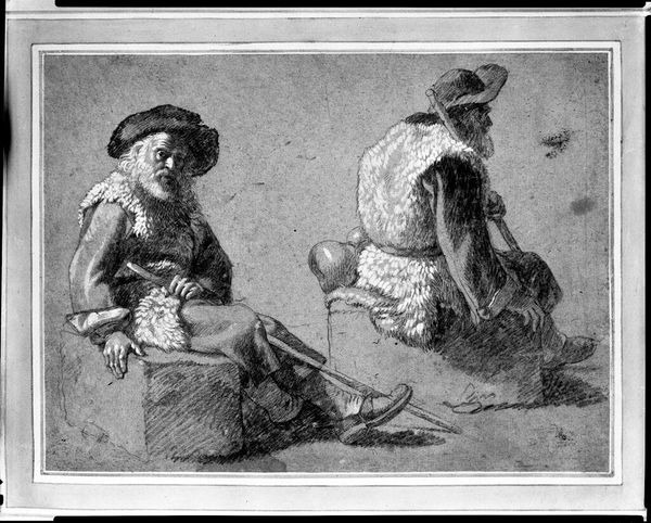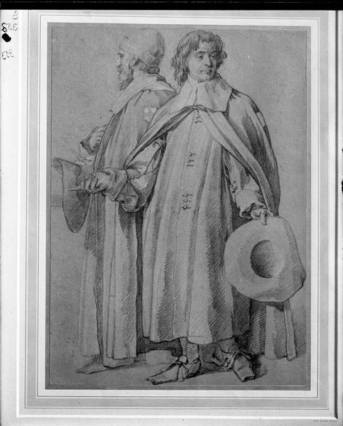 Editor: Here we have Merry Joseph Blondel's "Three Figures in Renaissance Dress." It’s undated, rendered in ink wash, and what strikes me is the assertive gesture of the figure on the left. What do you make of it? Curator: It is fascinating how Blondel, working in the 19th century, appropriates Renaissance garb. Is this merely historical fascination, or does it speak to the role of power, class, and gender in constructing a historical narrative? Perhaps the pointing figure symbolizes the gatekeeper of knowledge, deciding who gets access to the past. Editor: That's a great point; I hadn’t considered the power dynamic embedded in the image itself. Curator: Exactly! And the Renaissance, often idealized, becomes a battleground for contemporary concerns. Food for thought, isn't it?