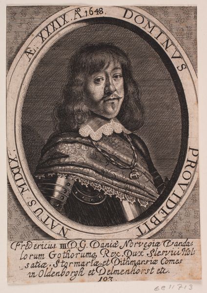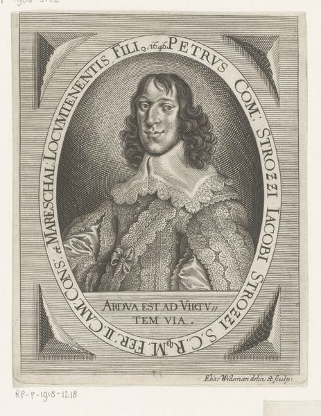 This engraving of Christoph Ferdinand Fernberger was created in 1645 by Elias Widemann. Notice how the composition, dominated by an oval frame, is a study in contrasts. The subject, rendered with meticulous detail, is set against a background of dense, uniform lines. Widemann's strategic deployment of line and form invites deeper inspection. The sitter's features, though diminutive in the overall composition, are strikingly vivid, indicative of his high status. The geometric exactitude of the frame clashes with the fluid lines of Fernberger's hair and clothing, creating a dynamic tension. Consider the semiotic implications of this contrast. Does it challenge fixed meanings, or engage with new ways of thinking about space, perception, power, or representation? This tension underscores the portrait's central theme: the individual versus the structure, challenging the viewer to consider the relationship between identity and the systems that define it.