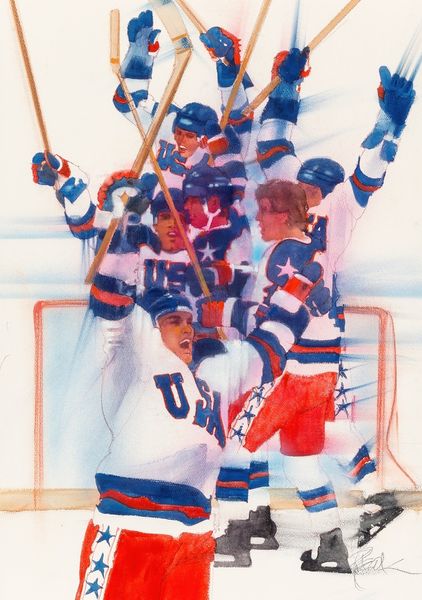 LeRoy Neiman made this painting of a hockey game with confident strokes and a bold palette. I love how the energy of the game is captured through these expressive marks. The materiality here is palpable; you can almost feel the speed of the brush as Neiman lays down each stroke. Look at how the blues and yellows of the players' uniforms bleed into the ice, creating a sense of movement and chaos. Notice the thick, juicy paint, applied with a kind of urgency that mirrors the intensity of the game. The red streaks around the net, almost violent, punctuate the composition, injecting a raw emotion into the scene. Neiman's gestural approach reminds me of some of Joan Mitchell's abstract landscapes, where the subject is less about representation and more about capturing a feeling. "French Connection" isn't just a painting of hockey; it's a visceral experience.