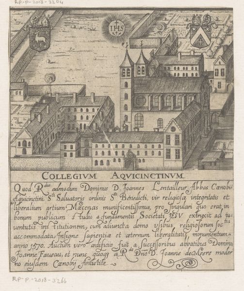 Curator: This intaglio print, entitled "Theologieseminarie," was crafted sometime between 1605 and 1680 by Filippo Ferrari. Editor: It's fascinating. At first glance, I’m struck by the artist's perspective. That bird’s eye view lends a formal and somewhat detached feeling, as if we’re scrutinizing the institution it depicts. Curator: Absolutely. What's especially important here is how Ferrari is capturing not just a building, but an institution, a place of power and religious formation. Its historical context is crucial: theological seminaries like this were, and are, deeply embedded within socio-political systems. Editor: You see the inscription at the bottom? I see Latin text framing it as this beacon for religious liberty for the sacred study of letters and excited 50 people and generously endowing it in the year 1606. Curator: That's it exactly. We're invited, essentially, to participate in this foundational narrative of religious propagation of liberty through the investment in students who might otherwise experience disenfranchisement. Ferrari's work here serves to broadcast power and garner patronage. Editor: The precision of the lines is impressive, considering the era. And I imagine prints like this circulated widely, disseminating these ideas. But I also see something...austere in the architecture. This calculated rationality could feel quite restrictive and, in essence, not as liberating. Curator: That tension you feel between a promise and reality is spot on. Feminist scholars would point to how historically seminaries exclude women. Moreover, consider the colonial context in which religious education served as both a means for intellectual engagement and for cultural domination. Editor: Thinking about it that way adds layers. So, the work is as much a reflection of ideals as it is of inherent social controls. Thank you for shedding light on these essential aspects, Curator. Curator: My pleasure. Seeing historical objects like these within their evolving networks helps us critically understand the complicated relationship between belief, institution, and power.