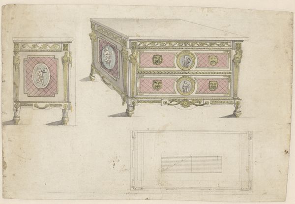 This is Thomas Chippendale's "French Commode," a design from the 18th century rendered in pen and ink. The commode is adorned with potent symbols that echo through time. Note the rams' heads at the top, emblems of virility and power since antiquity, adapted from ancient sacrificial traditions. These symbols resurface repeatedly—from Greek temples to Renaissance paintings—each time imbued with renewed cultural significance. The acanthus leaves, swirling with life, evoke classical motifs of growth and prosperity. Consider how these decorative choices reflect deeper cultural currents. Are these motifs merely aesthetic, or do they tap into something more primal? The commode becomes more than furniture; it's a stage where symbols enact an ongoing drama of human experience, reflecting our collective memory.