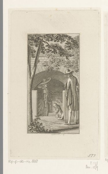 Curator: Reinier Vinkeles created this delicate drawing in 1815, titled "Man en jongen in een bos," or "Man and Boy in a Forest." It's an engraving in ink on paper and currently held in the Rijksmuseum. Editor: There's a wistful quality to this piece. It’s quite small, contained, like a vignette, and the muted tones contribute to a subdued mood. What do you make of it? Curator: Vinkeles, primarily an engraver, frequently depicted scenes that blurred genre painting with landscape. Looking closely at the process of engraving, you notice the lines creating the shadows and depth. These finely etched marks are built up through skillful manipulation to build the overall image from simple material. It really highlights his labor. Editor: Right, it does draw attention to the act of creation, but let's think about those figures. Their interaction, or lack thereof, raises some interesting questions. Is the boy an apprentice? A son? The social hierarchy is subtly displayed, isn’t it? Curator: Potentially. During this period, apprenticeship was central to workshop production; it trained craftsmen who could replicate an art style for larger public consumption. The location being a forest suggests labor may also apply outside the typical atelier setting. Editor: Precisely. Also, let’s look at Romanticism's themes of nature and individual experience. But I wonder, whose experience are we seeing? Is it the privileged gaze of the man, positioned as the central figure, or is the boy being positioned in servitude? How does it implicate those power dynamics? Curator: That's a critical lens that enhances the meaning. The engraving allowed for reproductions to proliferate quickly through the mid-19th century, changing distribution and contributing to a new consumerist market, of which Vinkeles participated directly by producing works accessible to a wide range of public audiences. Editor: Thinking about its time— post-French Revolution, pre-industrial boom – a print like this spoke to emerging anxieties and aspirations. Was it for the elite drawing room or to inspire broader notions of landscape ownership and aspiration? The man, standing upright with nice clothing, certainly has that. Curator: Ultimately, by examining its material execution in connection to that social moment, it unveils its complicated connection to material conditions during the early 19th century. Editor: Agreed, it leaves us to consider the relationships not just depicted within the image, but also the artwork’s place within shifting social currents of the day.