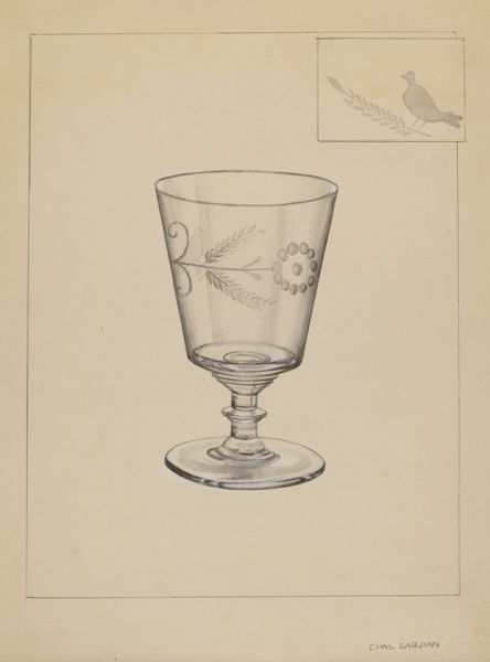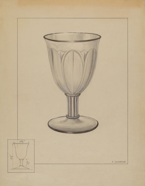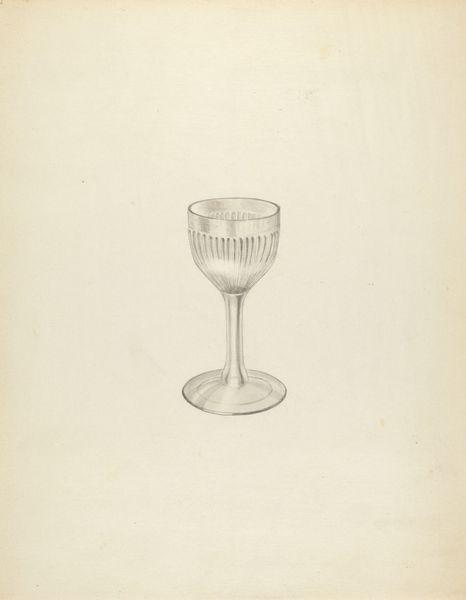Curator: Here we have John Dana's drawing titled "Glass," created in 1936 using pencil on paper. Editor: It's surprisingly delicate for a pencil drawing. I mean, look at the rendering of light and shadow; the glass practically shimmers. It evokes a certain quiet elegance, don't you think? Curator: Yes, and that elegance would likely have been part of the social theater of the time. This isn’t just any glass; it represents an aspiration to refinement and perhaps even a certain level of economic comfort during the Depression era. Editor: You can certainly infer that, but look at the technical skill! The way Dana captures the refractive properties of the glass. Observe how the delicate etching at the top is handled with precise line work, giving way to the smooth, flowing curves of the base. Curator: And yet, even the artistry exists within a context. Such detailed depiction might reflect the increased value placed on craftsmanship during periods of economic hardship, emphasizing traditional skills over mass production. Editor: Possibly, but its simplicity transcends that, it is beautiful for beauty’s sake! See how the pencil work remains visible— it reveals a love of process. Notice also, the slight imperfections within it makes it appear authentic and human. Curator: Precisely, those apparent "imperfections" are revealing because they represent the tension of an object— both within reach, yet outside of economic realities for most people in that time. That little mark over there seems like a poignant reflection of the struggles to realize that ideal in one’s everyday environment. Editor: Perhaps we’re both projecting somewhat onto this humble glass, however the form itself, through expert usage of tonal shifts, creates a surprisingly evocative effect and transcends the representational object. Curator: A very delicate, yet powerful symbol of the cultural ambitions held during that era. Editor: Exactly, something that holds form, and cultural symbolism in such a delicate rendering as this drawing of glass.