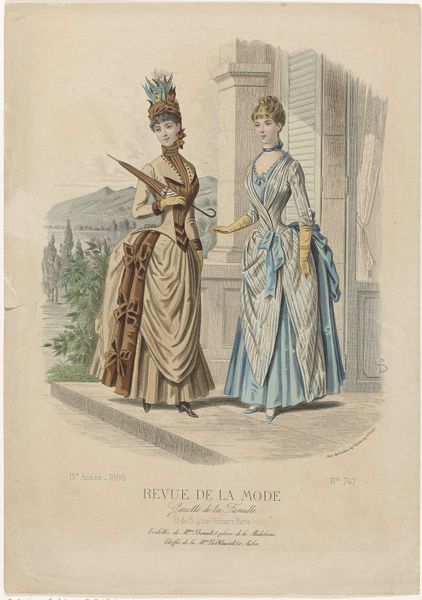 Curator: Ah, yes, this is a print entitled "Revue de la Mode, Gazette de la Famille, dimanche 29 novembre 1885, 14e Année, No. 726: Toilettes de Mme Guillot," created by A. Chaillot in 1885. It seems to be an engraving with watercolor detailing. Editor: Wow, that's a mouthful! My first impression is that it feels almost dreamlike, with those soft pastel colors and intricate lace. It's like peering into a very fancy, very polite dream. Curator: The romanticism style certainly contributes to that dreamy effect. Prints like this, especially in fashion magazines, were key in shaping aspirations and reflecting societal values. The clothes here aren't just garments; they’re social signifiers. Editor: Absolutely. I'm curious about the lace. It looks so delicate and almost ephemeral, but also structurally so important to the design of the dresses. Like, is it about beauty or some crazy constraint on women’s movement at that time? Or is it both? Curator: A sharp question! Lace holds many layers of meaning. It represented luxury, status, and refinement, of course. But psychologically, it could also signify confinement, or perhaps a screen--literally or figuratively--between a woman and the world, which she had to navigate according to a highly prescribed social code. Editor: A screen, that’s really evocative. I imagine flipping through these images, yearning for this beautiful but inaccessible world… while simultaneously wanting to tear the lace and restrictive expectations away. There’s real tension there. Curator: The enduring power of images like this lies precisely in that tension. We can still access the visual language of desire, constraint, and aspiration woven into these textiles, lines, and poses. The visual rhetoric remains legible, if we are attentive. Editor: That’s fascinating! I was caught up in the visual candy, the gorgeous rendering. But knowing about all of that background kind of empowers me to really 'read' the print for what it signifies to me. Curator: Precisely. Visual symbols act as memory keys, allowing us to understand, critique, and reimagine our past, and maybe adjust our direction into the future. Editor: Exactly. Looking at this, I am reminded of all the historical and societal expectations pressing down on us and the ways we choose to navigate that even today.