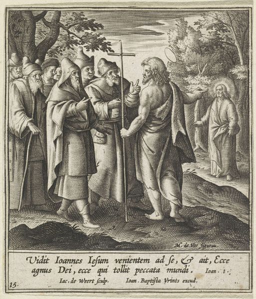 Curator: This print, dating roughly from 1580 to 1600, is titled "Ondervraging van Johannes de Doper," or "The Interrogation of John the Baptist." It comes to us from the hand of Jacob de Weert. Editor: The somber atmosphere strikes me immediately. The sharp contrast between light and shadow creates a dramatic intensity, almost trapping John the Baptist in this pivotal moment. Curator: Absolutely. This is characteristic of Northern Renaissance engravings, favoring detailed figuration and historical narratives. Note the architecture of the figures themselves, their postures and expressions frozen mid-narrative. Editor: The iconographic density here is palpable. John's staff, topped with a cross, identifies him immediately. But look at the clothing and postures of the interrogators—they denote status, questioning, doubt, and a sort of uneasy defensiveness all at once. What do you see? Curator: Indeed. These men represent the established religious authority. They're positioned so closely to John, invading his personal space as a way of trying to destabilize him and reclaim control of the religious landscape. Editor: Control is the core issue, isn't it? John is challenging the established symbolic order. He is rendered slightly averted to his accusers. Look at their hand gestures: almost theatrical with a slight unease; compare this with his apparent steadiness! It adds layers to their portrayal as figures caught between power and anxiety. Curator: Precisely, engravings such as these served a didactic purpose. They were affordable and could circulate widely, informing and reinforcing the public's understanding of biblical events, but also perhaps subtly critiquing existing hierarchies. The scale of the piece too: not overwhelming, making it intimate. Editor: Intimate, but loaded with visual symbols that speak volumes about power, belief, and the looming presence of dissent. I appreciate that Weert used light, not as a strictly illustrative method, but as another symbolic element of great tension. Curator: Considering its production during a time of religious reformation, its narrative holds even greater significance. It reveals art's crucial public role and the potency of imagery when it’s interwoven with socio-political undercurrents. Editor: Seeing how carefully visual languages from the past speak to themes of authority, conviction, and challenge remains truly illuminating, all thanks to art like this.