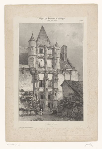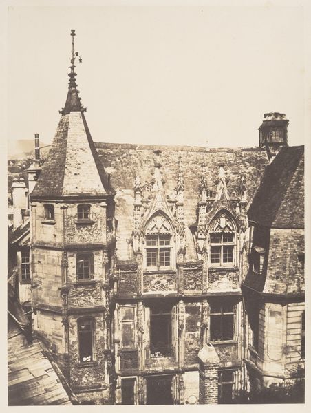 Editor: This is "Fragment du Palais de Justice, Rouen" created between 1852 and 1854 by Edmond Bacot. It's a photograph, so a print of the architecture. I’m really struck by how the ornate details practically leap out, even in a monochrome image. What’s your take on this piece? Curator: The overwhelming amount of architectural detail is deliberate. We see a fragment, yes, but it is charged with signifiers of history and power, both secular and sacred. The elaborate Gothic tracery, the statuary, and the sheer verticality all speak to a specific cultural memory rooted in medieval grandeur and its reinvention. Look how Bacot frames the building against the sky, accentuating that ascent, suggesting a continuity of values from that earlier time, reborn here in nineteenth-century Rouen. Editor: That’s interesting, I hadn't thought about the sky's role in emphasizing verticality and its symbolic role. It feels almost staged. Are there symbols you are drawn to in the image? Curator: Think about the facade itself. Notice the niches where one would expect saints or important historical figures? What does their presence--or potential absence--communicate about changing social attitudes towards the figures they are supposed to symbolize? Is this a monument, or a relic, or a kind of palimpsest? How do these layered meanings inform our interpretation of law and justice in that moment? Editor: So it’s not just about architectural details for their own sake, but rather, those details represent larger social ideas, right? It makes me want to read more about the Justice Palace and French history! Curator: Exactly. It is about the visual echoes of meaning across time, mediated here by photography. What have you discovered in our exchange today? Editor: I am struck that this image represents much more than the architectural scene depicted and, through careful study, can become a doorway to historical and symbolic narratives! Thanks.