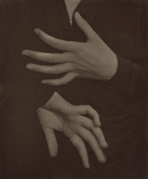 Curator: Before us, we see Alfred Stieglitz’s "Georgia O'Keeffe—Hands", a photograph he created in 1917. The print itself demonstrates Stieglitz's exploration into modernism through photography and it portrays O’Keefe’s hands intertwined with striking clarity against a muted, dark backdrop. Editor: Oh, the sheer tenderness! It feels so intimate, doesn't it? The grayscale palette emphasizes the delicate texture of skin, the subtle gradations. Almost sculptural in its quiet grace. Curator: Precisely. Stieglitz was very interested in elevating photography to the level of fine art. One way he achieved this was through careful attention to the print-making process itself and darkroom manipulation, and also his avant-garde compositional choices. His use of light is incredible in capturing not just the form of her hands, but suggesting their vitality as tools of her craft. Editor: I can see that. They're poised, like dancers at rest before they begin a new piece. What kind of impression do you think Stieglitz was aiming for when making this image? I imagine that the way artists use their hands holds such emotional importance... it reflects on the ability to craft, express, and connect. Curator: I would venture that this image is steeped in their personal story. These were pivotal times for both artists as they explored themes of intimacy and the role of the artist's hand. And while this print looks so simply constructed, the deliberate choice to focus on her hands is no doubt charged with meaning. Editor: I find it beautifully unsettling. Almost an homage to labor, really. Especially as O'Keeffe was just beginning to find her stride as a great American Modernist, right? What a symbol—hands holding promise! Curator: Indeed. It reflects a dialogue with traditional notions of portraiture too. Hands tell stories, especially for artists; his strategic capture encourages contemplation of how meaning itself can be embedded in labor and physical interaction with materials. Editor: True. It's like these are hands in a language of their own. Looking closely, you could swear these very hands were speaking of ambition and independence through every single vein. Stieglitz managed something genuinely special when he clicked that shutter! Curator: A truly captivating portrait. And on close inspection, you'll certainly see a real testament to Stieglitz's enduring creative vision. Editor: Absolutely. A fleeting glimpse that leaves so much for the heart to conjure up, even long after seeing it for the first time.