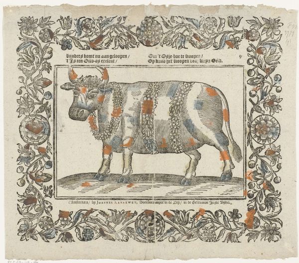 This hand-colored woodcut, made by Johannes Kannewet, presents four animals for the "young youth" of the Dutch Republic. The print presents itself as a kind of menagerie, featuring a horse, cow, elephant, and lion. Kannewet worked as a teacher, so this print likely served an educational function, to help children learn about the appearance and nature of different animals. But the image also speaks to the culture of commerce, where, by the 17th century, the Dutch Republic dominated international trade routes, bringing exotic animals like elephants and lions into the realm of the known. The Dutch had also become leaders in zoological and anatomical study, with an eye to rationalizing the natural world. Understanding the history of such images requires researching the economic, scientific, and educational practices of the time. The print is not just a quaint depiction of animals; it's a window into a world that was rapidly expanding its reach and knowledge.