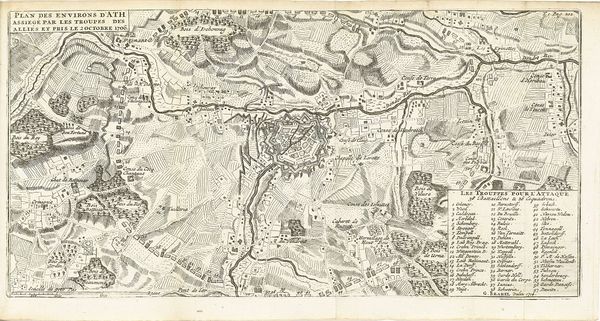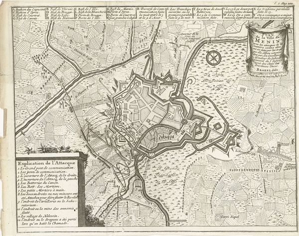 Editor: This is "Kaart met de linies van de geallieerden bij het beleg van Namen, 1695," an engraving in ink on paper, created in 1695. It feels… more like a document than a piece of art, but there’s a certain stark beauty to it. How do you see this work functioning in its time? Curator: It's crucial to remember that "art" wasn't always separated from practical pursuits the way we often see it now. This map, while visually striking, was fundamentally a tool of war. Consider how these images shaped public understanding and opinion during the Nine Years’ War. Who would have been consuming this image? Editor: I suppose military leaders for strategic planning, but maybe also the general public? Were maps like these widely disseminated to generate support for the war effort? Curator: Exactly. These weren't neutral documents. They projected power. Notice how the city is depicted— what's emphasized, what’s minimized? The rendering of nature surrounding it seems almost… idealized, yet is entirely strategic. These images served as propaganda, shaping perceptions of the siege and the authority of William III. The Baroque style lends it a certain grandeur, don’t you think? Editor: I see what you mean. So, it's less about objective accuracy and more about crafting a particular narrative of control. Is that why the geometric forms are so important? To communicate order and planned military actions? Curator: Precisely. The lines demarcating troop placements, fortifications, and strategic points aren’t just informative; they visually reinforce the idea of a controlled, calculated military campaign. It is, in essence, visual spin. Editor: That changes how I see it entirely. It's fascinating to think about how something so seemingly technical can also be a powerful statement. Thanks for that insight! Curator: My pleasure. Examining art within its historical and social context always enriches our understanding and opens new avenues for interpretation.