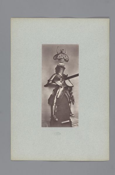 Curator: Here we have a gelatin-silver print of a 15th-century armor for a knight in Charles VII of France’s army. The original armor is from the collection of the Musée d'Artillerie in Paris. Editor: Wow, this image immediately strikes me as eerie. The stark monochromatic tones enhance a ghostlike feel, don’t you think? Curator: Indeed. The anonymous photographer captured the inherent textures and material properties through the lens; note the cold sheen of the metal against the softer suggestion of cloth, the intricate articulation of the joints. This photograph operates almost as a document, preserving this object for future analysis. Editor: Yes, but it also does more, I think. There is something unnerving in capturing war like this. It transforms something deeply, brutally physical into something quite still. It gives a spectral form to violence. And that elaborate helmet—is that an animal figure on top? Curator: Precisely! It’s a quite common decorative element to the period and signals both wealth and power. And by staging it so deliberately, atop a plinth, the photographer transforms mere armor into something monumental and perhaps allegorical. Editor: It makes me wonder who wore it, this suit of armor. Did he imagine this would be his legacy? That his death-dealing suit would outlive him in a picture? It has a haunting beauty. Curator: It also is a compelling piece because of its ability to highlight aspects of material culture, presenting them in a form accessible for later interpretation through photographic reproduction. Editor: It’s incredible how something seemingly inert, like this artifact captured on photographic paper, can still conjure up such strong emotions. What we see can reach out and grasp the intangible aspects of life, of existence itself. It asks so much.
