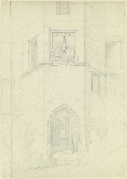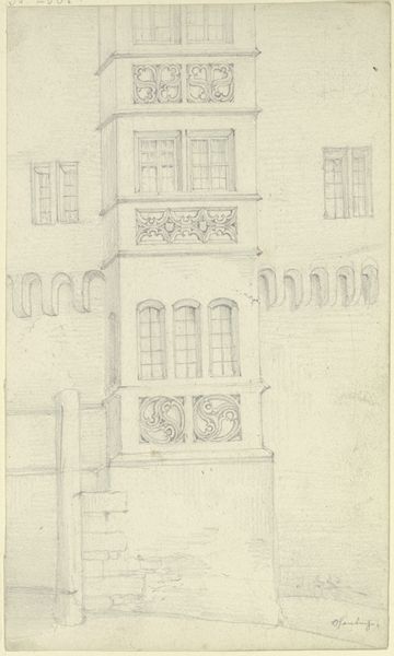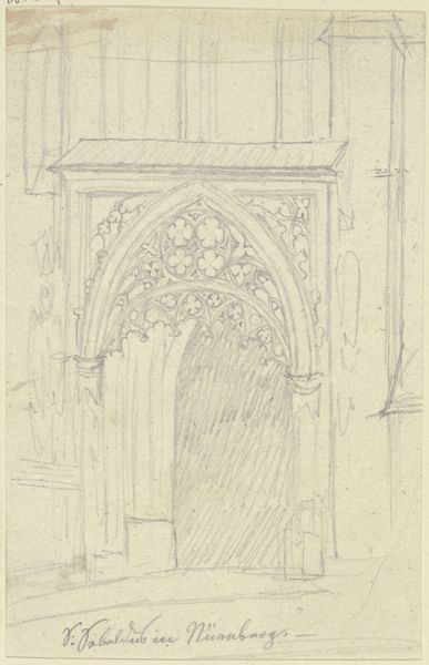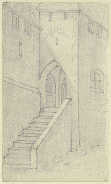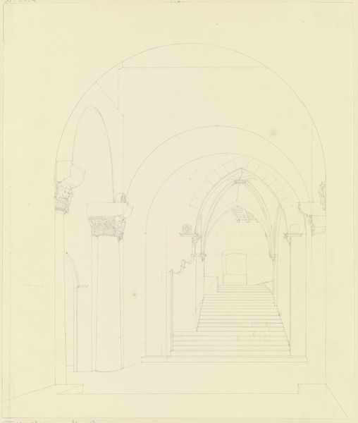 Curator: What a curious piece. A quick glance tells me this is an architectural study. Perhaps for a theater set? The perspective is slightly unsettling. Editor: This architectural drawing, entitled "Mit Arkaden umgebener Innenhof", which translates to "Courtyard Surrounded by Arcades", is attributed to Karl Ballenberger. It's rendered in pencil on paper and held in the Städel Museum collection. The timeframe suggests a 19th-century creation. Curator: Interesting. Ballenberger then gives us something like a perspectival exercise. The lines are precise but skeletal. It lacks the vibrancy of a finished work, leaving it oddly sterile despite its complex structure. What function did such precise preliminary sketches serve in architectural practice, generally? Editor: Architectural drawings such as this were essential tools in the 19th century, serving multiple roles beyond mere aesthetic representation. This kind of architectural study was typically commissioned by wealthy patrons seeking to impress or even influence socio-political conversations. The level of detail often served as a mark of cultural refinement on both sides. Curator: Note how the use of negative space articulates volumes, how each gothic arch echoes with almost infinite depth. Semiotically, these empty doorways hint at absences and potential, promising what might be just beyond our view, but just as significantly, denying its fulfillment. It certainly suggests wealth. What are your thoughts on its contemporary relevance? Editor: It is hard to determine Ballenberger's patrons in this case since it is unknown when he created this work. Still, it speaks volumes about the intersection of artistic and practical knowledge, the role of art in shaping our built environment, and ultimately how the power of influence permeates. A closer study reveals much. Curator: You are right, it holds value as a key object linking the visual and societal histories, an artistic snapshot into a particular point in history. Editor: Indeed, a powerful intersection. I appreciate you sharing your expert semiotic analysis with me today. Thank you.