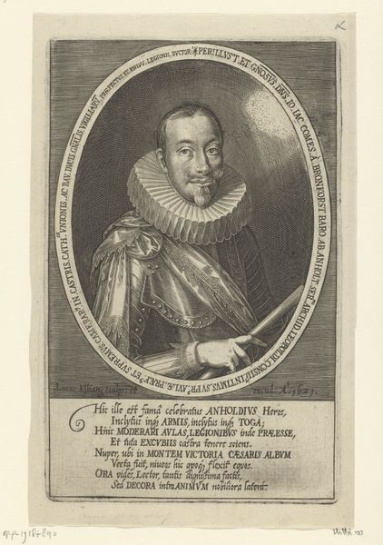 This print of Wolfgang Wilhelm, Count Palatine of the Rhine, was made by Simon de Pas in the 17th century. It's an engraving, meaning that the design was incised into a metal plate, likely copper, with a tool called a burin. Ink was then applied to the plate, forced into the lines, and the excess wiped away. Finally, paper was laid on the plate and run through a press, transferring the ink and creating the print. The lines that define Wolfgang's features, his elaborate ruff, and the surrounding ornamentation, are all products of this process, with the varying width and depth of the lines creating light and shadow. The amount of labor involved in such a detailed engraving is considerable, reflecting the value placed on skilled craftsmanship. Consider how this contrasts with modern modes of image production. Prints like this were luxury items, requiring both artistic skill and mechanical expertise to produce. This is a far cry from the ease and speed of digital printing today, and an important reminder of the social and economic context in which this image was created.