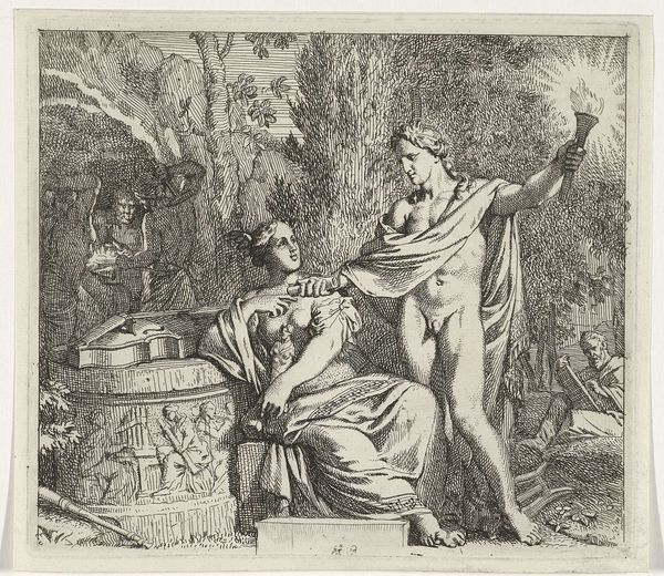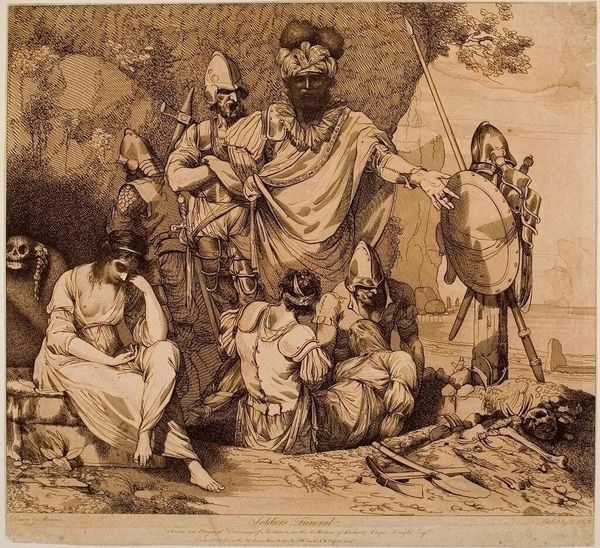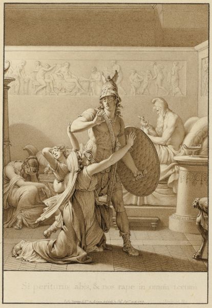 Curator: Standing before us is Bartolomeo Pinelli’s 1809 drawing, "Telemachus Requests Permission from Pluto to Seek His Father in the Underworld". It depicts a key moment from Homer’s Odyssey. Editor: Immediately, I'm struck by the theatrical quality of the scene. The earth-toned palette lends a somber and weighty atmosphere to this depiction of the underworld, focusing attention on the musculature and material presence of the figures. Curator: Indeed, Pinelli, drawing on neoclassicism, emphasizes formal clarity to underscore the epic nature of the narrative, representing ideas of legitimate rule in classical mythology. The social context of 19th-century Europe heavily influenced how these myths were interpreted. For example, representations of powerful men can sometimes legitimize contemporary patriarchical societal structures. Editor: It's interesting to note how Pinelli uses simple materials—primarily ink or wash—to evoke a sense of monumentality usually associated with sculpture or grand history paintings. The texture of the paper itself almost feels like aged parchment, enhancing the feeling of ancient drama unfolding. Curator: Right, think about what ‘heroism’ meant then: duty to family, obedience to authority. These were values deeply enmeshed with the political and social fabric of the time, even if cloaked in mythic garb. The contrast between Telemachus, the dutiful son, and the all-powerful Pluto, underscores hierarchical power relations. Editor: And those subordinate figures, hunched in sorrow. Their labor of suffering is quite materially evident; their forms echo the stone-like environment of Pluto’s realm. Do you see how Pinelli, despite referencing classicism, allows glimpses of the physical world, its textures, to seep into the composition? Curator: It begs the question, though: whose perspective is prioritized in these grand narratives? Who has the permission to even seek out their relatives and ancestors, as well as the emotional landscape they were given access to? Does the artist take any considerations regarding social structures? Editor: True. The limited tonality itself, however, brings me back to this idea of 'making do'. How much visual and material complexity can an artist wring out of seemingly restricted means? What does he tell of access and production by doing so? Curator: It is fascinating how artworks like these not only retell stories but actively participate in shaping our understanding of complex social narratives, which has shaped global cultures throughout history. Editor: It highlights the remarkable ability to evoke epic emotions and monumental themes. Its very existence makes me examine my relationship with labor through material consumption and production.