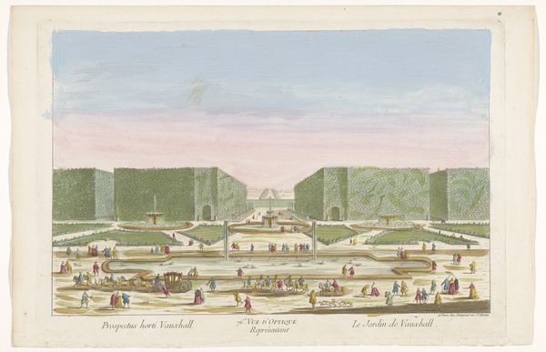 This print, depicting Vauxhall Gardens in London, was made by Jean-François Daumont. The image is an etching, a process that starts with a metal plate, usually copper or zinc. The plate is coated with a waxy, acid-resistant substance. The artist then scratches an image into this coating, exposing the metal beneath. When acid is applied, it bites into the exposed metal, creating lines. The longer the acid bath, the deeper the lines. Ink is then applied to the plate, filling these lines, and the surface is wiped clean. Finally, the plate is pressed onto paper, transferring the ink and the image. Colored inks were likely applied to the plate using stencils to selectively color the different areas in the print. The success of printmaking like this was tied to a growing leisure culture. The result is not just an image, but a record of labor, skill, and the means of its own reproduction. In essence, this print invites us to consider not just what we see, but how it came to be, blurring the lines between art, craft, and the economics of leisure.