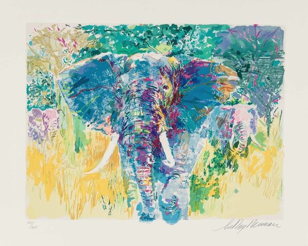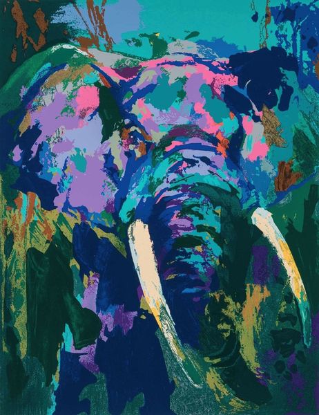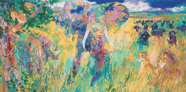 Editor: So, this is LeRoy Neiman's "Elephant Charge" from 1999. It’s an acrylic painting, and what immediately strikes me is how Neiman uses all these vibrant colors to portray something as massive and, well, grey, as an elephant. How do you interpret the symbolism behind this vividness? Curator: The colours are indeed intriguing, aren't they? Consider the elephant, a symbol across cultures. In some traditions, it embodies wisdom, strength, and good fortune, and royalty in some, while others might see it representing raw power. But look at the palette Neiman chose – is this solely about representing the animal? Or does the fauvist application of color hint at the disrupted harmony in our relationship with nature? What does that charge really signify? Editor: That's a very interesting point. I had not considered the relationship with nature. I suppose the “charge” might not just be physical, but also symbolic, about conflict. Curator: Precisely. It’s an invitation to question: are these vibrant hues a celebration, or are they a cry for awareness about the diminishing space for such magnificent creatures in our world? This, with the distorted expressionist representation of form. The image becomes not just about seeing, but feeling— feeling the precariousness of their existence. Editor: So the emotional impact, the intensity of the colors, underscores the symbolic weight of the elephant's struggle… I definitely see the power of those colors now. Thanks for opening my eyes. Curator: And thank you for yours. It reminds us that even in art, memory, feeling, and the urgency of the present are eternally linked through symbols and colour.
