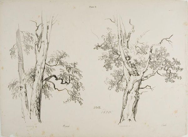 Editor: Here we have James Duffield Harding's "Lessons on Trees, plate 7." It's difficult to date precisely, but it showcases different trees in ink, almost like a botanical study. The starkness of the branches gives me a wintry, almost melancholic feeling. What do you see in this piece? Curator: I'm immediately struck by Harding’s sensitivity to form. He wasn't just documenting; he was capturing the *essence* of each tree. Look how he uses the ink to suggest texture and light. It’s a lesson in seeing, really, isn't it? He invites us to slow down and contemplate the skeletal beauty of nature. Does it make you want to grab a sketchpad and head outside? Editor: Absolutely! It's inspiring to see such detail with so few strokes. I guess I hadn't considered the emotional side of botanical illustration before. Curator: Precisely! Art, like trees, often gives us more than we initially expect.
