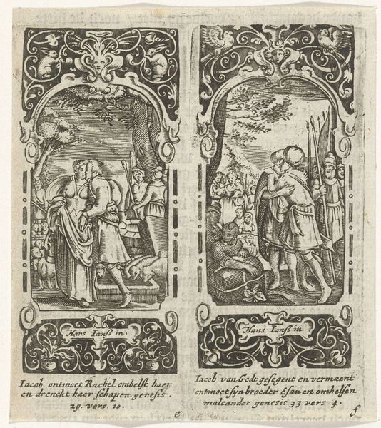 Curator: This artwork, residing here at the Rijksmuseum, is called "Two vignettes with three putti among buildings". It's a drawing in pen, likely an engraving, produced sometime between 1717 and 1783 by Jacques Philippe Le Bas. What strikes you first about this piece? Editor: The delicate lines! There’s an airiness to the scenes, a whimsical lightness that seems characteristic of Baroque sensibilities, yet… almost feels sparse here. Curator: Sparse in what sense? The abundance of cherubic figures doesn’t register as a type of excess? Editor: I think I read it more formally. There is detail in the architectural framing, but notice the background buildings, almost hinted at rather than described. This gives each composition depth, of course, but feels somehow like stage sets – carefully placed, deliberately arranged. Curator: Yes, that’s a fair assessment. The “stage set” is a clever metaphor; these vignettes were designed during a time when social order and display were paramount. Cherubs often acted as symbols of innocence but could also represent status and the potential lineage of powerful families. Editor: Lineage even here, among playful architectural tableaus? It’s not readily apparent. Is the placement of putti particularly meaningful? The way they are grouped? Curator: Placement tells us about accessibility and social hierarchy of that era. The vignettes give the impression of staged access to ideal upbringing and social place, something which wealthy patrons strived for themselves in reality. Notice the subtle positioning, framing these cherubs carefully among classic building types. Editor: That’s an interesting idea. And considering how many of Le Bas' works served as book illustrations and other forms of reproduction… This artwork becomes an item consumed in a commercial market that helps visualize very real, and yet still quite dream-like possibilities. Curator: Precisely, this drawing can act as both artistic accomplishment in its own right, as well as functional document speaking to contemporary power structures in European high society. I am very grateful for your formalist perspectives illuminating further dimensions to this seemingly simplistic engraving!