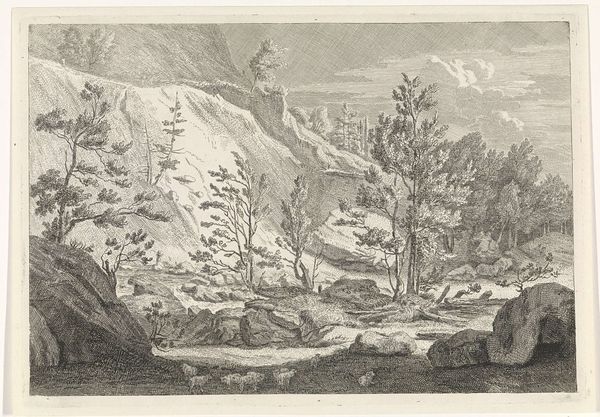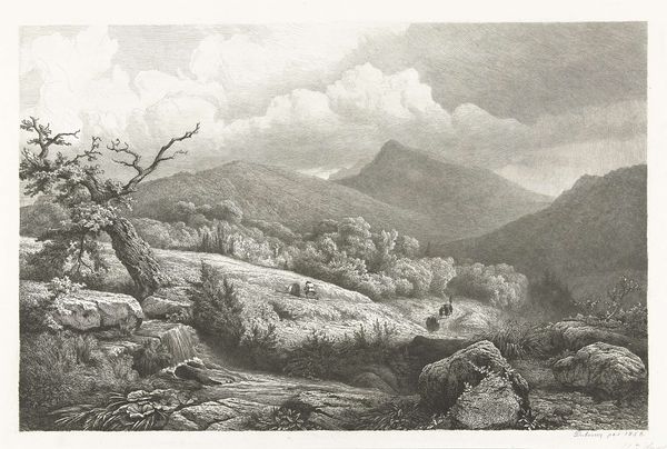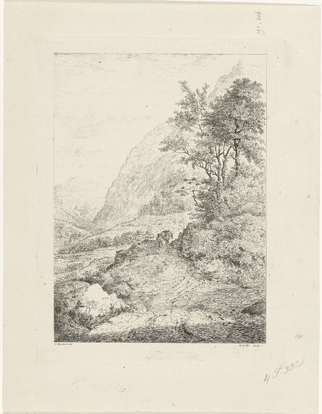 Editor: So, this is Pierre Louis Dubourcq's "De begraafplaats te Baden-Baden" from 1856. It's a pencil drawing, and what strikes me is the incredible detail. The artist meticulously rendered every leaf and stone, creating such texture. What's your take? Curator: Look closer at that meticulous detail. The labor involved in creating such a detailed landscape drawing is considerable. Think about the context: 1856. Photography existed, offering a quicker, arguably "more accurate" depiction. So why dedicate so much time to a hand-drawn image? Editor: Maybe to show artistic skill? It seems like the artist wanted to impress us. Curator: Perhaps. But consider the materials themselves. Pencil – a readily available, relatively inexpensive medium – is used to depict a very specific place. How does the act of representing a burial ground, a space tied to ideas of legacy and remembrance, through this readily accessible material change our understanding? Editor: So, you're saying the "humbleness" of the medium contrasts with the grand landscape and the somber subject matter? Curator: Exactly. The artist chooses to invest intense labor into a 'lowly' material like pencil to represent a grand landscape, a gesture laden with social implications, which redefines notions of artistry itself. Editor: That's interesting. I hadn’t considered the implications of choosing pencil over, say, oil paint. Curator: By examining the choice of material, the process, and the social context, we get a much richer understanding of the work and what it means to represent a place of death in 19th-century Europe. It isn't just a pretty picture; it is a statement about production, value, and labor. Editor: I definitely see it differently now. Thanks for pointing out the connection between the material and the message. I'll pay closer attention to material choices from now on.
