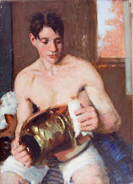 Editor: Here we have "Seated Young Man in White Shorts" by Denman Waldo Ross, its date is unknown and currently held at the Harvard Art Museums. The painting feels very intimate, almost like a snapshot of a private moment. What do you see in this piece? Curator: It is! A fleeting glimpse, precisely. Ross captures the sitter with an honesty that's both compelling and slightly unsettling. The brushstrokes are so immediate, aren't they? Loose, impressionistic… almost like a memory fading in and out of focus. Notice how the oranges in the background almost vibrate against the cool whites of the shorts. Editor: I didn't catch that at first! It gives the figure a vibrant, almost ethereal quality, right? Curator: Precisely! It’s as if Ross is saying, "Here is youth, fleeting, beautiful, and gone in a heartbeat." It makes you wonder about the relationship between the artist and his subject, doesn't it? Editor: Absolutely. Thanks! This has been incredibly insightful.