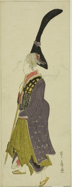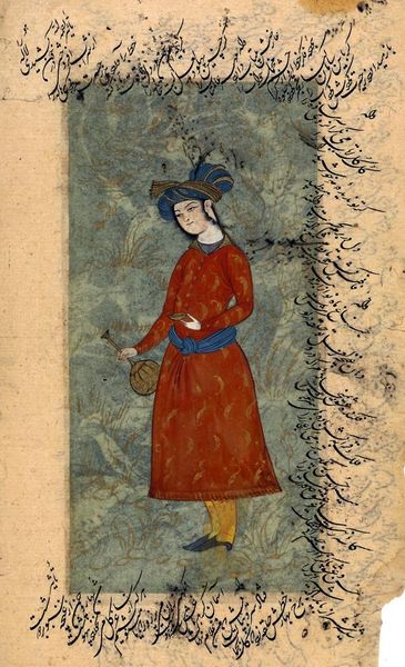 Curator: This exquisite "Persian Miniature," dating from around 1660-1687, offers a glimpse into a world of meticulous detail and artistic finesse. It's currently held in the collection of the Rijksmuseum. Editor: Immediately, what strikes me is the flatness. Not in a bad way, but how the materiality of it, probably watercolour, flattens any sense of real depth—makes it feel like something precious lifted from the pages of a book. Curator: Precisely. It's likely watercolour and coloured pencil on aged paper. It possesses the intimate quality of a page from a personal sketchbook. I see in it not just a portrait but perhaps a reflection on status. His attire hints at opulence and, dare I say, a touch of youthful naiveté, rendered with delicate precision. The texture in the coat is outstanding. Editor: Agreed, you can see the layers and layering, the hand that painstakingly crafted it. Think about the labour involved, especially considering the size of this miniature. It prompts questions about patronage: who commissioned it? Who were the intended viewers, and what materials were accessible, or even encouraged, during its creation? Curator: It brings up the concept of consumption as well, not in the sense of merely ‘possessing’ it but consuming its meaning, sharing in a narrative tradition through this image. Notice, too, the choice of colours - very subtle and muted, yet they somehow give an amazing vivacity to his expression. The subtle bleeding of the watercolour around his turban and dress speaks to both the delicacy of the medium and also the inherent uncontrolled forces one experiences in artwork. It hints at spontaneity within a rigidly defined form. Editor: And it forces a new appreciation for something usually labeled "sketchbook art." The supposed hierarchy crumbles, forcing us to rethink those value judgments based on supposed skill. It’s a social record as much as it is art. Curator: Indeed! What at first seems like a simple portrait then unveils so much, prompting reflections about identity, power, artistry, and the very materials from which this vibrant echo from the past has come. Editor: I find myself wanting to dive deeper into the history of pigments from that era – understand what constituted "precious" colour. What were the political forces governing those economies of production?