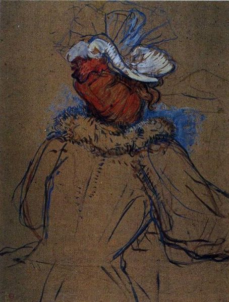 Paul Gauguin made this drawing with pastel on paper, it now resides in the Burrell Collection in Glasgow. At first glance, you see a woman with her back turned, but look closer at how Gauguin composes this image. The woman’s large, circular collar and headdress create an immediate sense of volume, which contrasts with the flatness of the paper. Notice how the rough texture of the pastel doesn't just depict fabric; it adds a tactile quality. Gauguin challenges conventional representation, by emphasizing the material presence of the artwork itself. The woman’s posture, hands on her hips, suggests self-assurance, yet her hidden face complicates a straightforward reading of her character. The seemingly unfinished background and visible strokes assert the artwork as a constructed object. Gauguin invites us to consider not just what is depicted but how it is depicted, reflecting a shift towards modernism. This piece engages in a dialogue about representation, perception, and the very act of seeing.