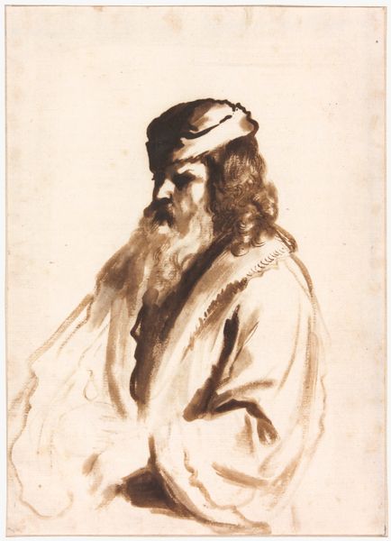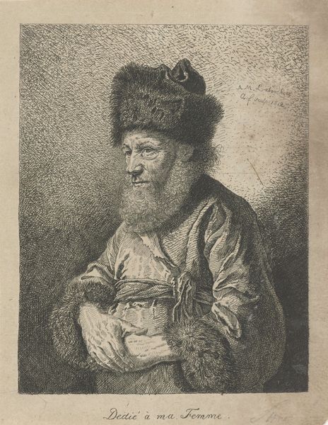Curator: Welcome. Editor: Here we have Rembrandt van Rijn's "Old Man with Beard," created around 1632 using etching. The detail in his beard and fur cap is incredible for a print. What do you see when you look at this work? Curator: The emphasis is clearly on the interplay of light and shadow. Notice how Rembrandt manipulates the density of the etched lines to create areas of deep darkness and contrasting highlights, particularly around the face and the folds of the garment. The strategic placement of these tonal variations guides the viewer’s eye. How does this structure affect your perception? Editor: It draws me to his face, the textures feel so palpable. It feels very intimate, yet still distant. The figure almost seems overwhelmed by the heavy shadows and dense texture. Curator: Precisely. Consider the artist's conscious deployment of line: closely hatched lines create darkness and volume, while sparsely distributed lines define areas of light. Observe how these graphic marks form a complex, almost tangible, surface. Editor: It’s like the lines themselves are constructing the form, not just describing it. The level of detail is exquisite for an etching, really bringing the figure to life. Did Rembrandt use these visual techniques in other portraits? Curator: Absolutely. Many of Rembrandt's works use chiaroscuro to establish a powerful contrast. By investigating these formal choices, we understand his artistic project and aesthetic ingenuity more comprehensively. Editor: That makes me appreciate the technical skill so much more. Thanks! Curator: Indeed. Close observation reveals the depth of artistic intention.