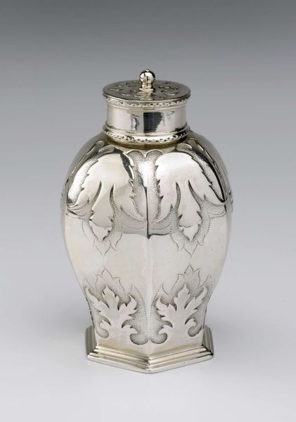 Editor: Standing here before "Theebus," crafted in 1731 by Jacob Groeneweg, I’m struck by its material presence. The silver seems to almost glow under the gallery lights, and the vessel, though relatively small, has a strong vertical emphasis. The way the body is divided into sections of vertical ribs and organic forms is quite compelling. What do you see when you look at this piece? Curator: Primarily, I observe the interplay of form and texture. Consider the articulation of the vessel's surface. Note how the artist contrasts the smooth, reflective planes with areas of intricate, almost floral chasing. The eye is invited to move from the base, where heavier ornamentation provides visual grounding, upwards along the fluted midsection, finally resting upon the detailed, repeating patterns on the rounded shoulder. The lid mirrors the decoration and caps off the structure. Do you see how these elements create a balanced, yet dynamic composition? Editor: I do. The repetition, now that you point it out, is critical, but so is the tension between geometric and organic shapes. Is there anything about its construction that stands out to you? Curator: Indeed. Observe the technique employed. The raising and chasing of the silver, particularly in achieving the crisp definition of the fluting and the intricate detail of the foliage, demonstrates a mastery of the silversmithing craft. The way that the reflections dance on its surface animate its stillness. How does that relate to the concept of 'function' as decorative art, do you think? Editor: That’s a great question. I guess the form truly dictates the experience of interacting with this artwork! Curator: Precisely.