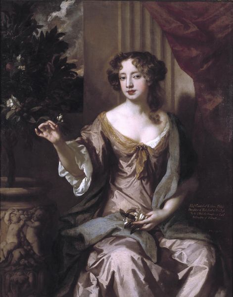 Curator: Let’s turn our attention to a portrait by Caspar Netscher, a Dutch Golden Age painter. This is a likeness from 1678 of Helena Catharina de Witte, wife of Iman Mogge, lord of Haamstede. Editor: My immediate response is that this portrait is dominated by blue—the richness of the blues and golds lend an air of regal composure. I feel invited to reflect on an older era. Curator: And Netscher's masterful handling of color and texture indeed demands a closer inspection. Helena, a woman of obvious stature, is captured amidst signifiers of wealth. Consider the interplay of light on her satin gown, for instance. How might we read this, not merely as a celebration of prosperity, but also through a lens of gender and power dynamics of the era? Editor: Well, notice the pearl necklace. Pearls symbolize purity and status, and in this period were associated with marriage, yet their subtle gleam against her skin suggests more than just decorous virtue. The lion-head fountain, as well, it can symbolize both strength and control over natural forces. Do you think its inclusion here attempts to speak about female agency during a male-dominated era? Curator: Possibly. Though, looking at the larger scope, the socio-economic reality was that women’s power, regardless of status, often played out within domestic confines or familial alliances. A woman's role during that period was primarily defined by her marital status and ability to produce heirs to ensure dynastic continuation. This may have served as a means to maintain existing power structures. Editor: You raise such a valid point about these social frameworks. Still, the composition, framing her with the romantic, but partially shadowed landscape behind her and the hint of classical architecture beside, perhaps speaks about the cultural inheritance noble women had control over, if not outright economic power. They played an important role, too. Curator: That's a compelling point, especially considering the Dutch Republic's focus on commerce and emerging bourgeoisie. This portrait acts almost as an attempt to elevate bourgeois power with a classical style, mirroring aristocratic representation but within the mindset of its own emerging societal class. Editor: Thinking about this piece overall now, I think my earlier read was correct; Helena is elevated and strong, but constrained within the confines of accepted nobility. Curator: And from a materialist perspective, Netscher demonstrates how the display of fine fabrics becomes not just a means of defining wealth, but is indicative of how social identities were actively constructed during the Golden Age.