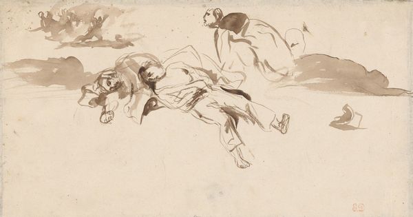 Curator: Telemachus slaying the lion. This pen and ink drawing by Bernard Picart, created between 1683 and 1733, is currently housed in the Rijksmuseum. It's quite striking, wouldn't you agree? Editor: Indeed. My immediate response is drawn to the visible struggle within the rough marks; the materiality of the sketch itself embodies that tension. It appears quickly rendered, almost as if captured on the spot, lending a sense of immediacy. Curator: That energy really comes across. Considering the mythological narrative, this is more than a simple fight. Telemachus, son of Odysseus, becomes a symbol of inherited strength, echoing his father’s legacy as he conquers the beast. What does the sketch reveal to you about labor, and class in this narrative? Editor: The swift pen strokes indicate perhaps preliminary workings—perhaps it was more about process rather than product, you know. In other words, the art of practice itself, and in its raw nature, it removes any pretense that high art holds versus the everyday workings of a draftsman’s labor. It hints at production without high-end polish. Curator: Absolutely. Picart was engaging with narratives common in his time. But consider the symbolism – the lion, often associated with royalty and power, is challenged and ultimately defeated by a younger hero. It brings forward ideas of changing social orders. Who wields the actual tool? How can marginalized communities rewrite and redefine these narratives? Editor: That brings forward issues of class! By demystifying the artist's hand and displaying it in a state of rough material, he exposes production practices. Moreover, the artist can be considered as a craftsperson here. It all contributes to a deconstruction of that idea that "fine art" somehow remains distant or sacred... I think that there are other dimensions here at play. Curator: I agree. The very act of drawing and the marks left behind represent more than a technical skill; it's a conscious claiming of representation. Looking at Telemachus then reveals how the historical context can highlight critical conversations surrounding empowerment, identity, and perhaps collective emancipation. Editor: Fascinating. Well, the unpretentious materiality has certainly shifted my perceptions here. The focus on materials—pen, ink, and paper—pushes forward considerations beyond mythic heroism. Curator: I'm walking away reconsidering both how and whose stories are told, and how art can advocate for these conversations.