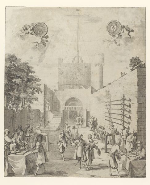 Editor: This is a pen and ink drawing called 'In 't Jaar 1572', made sometime between 1789 and 1810 by an anonymous artist. It depicts a troop of soldiers approaching a fortified city gate. It has a certain washed-out quality that makes it feel distant. What catches your eye? Curator: The gate itself becomes a potent symbol. The solid walls suggest protection, exclusion and also imprisonment, while the procession about to enter suggests invasion or possibly, liberation. What do you make of the blank flag? Editor: I hadn't even noticed the blank flag! It feels like an absence, perhaps awaiting definition or yet-to-be-decided allegiances? Curator: Precisely! Its emptiness becomes a vessel for interpretation, ready to be inscribed with meaning, ideals, or power. Note also the architecture in the background—does it echo structures from other periods? The artist makes no choice accidentally. Editor: Yes, there is what appears to be classical architecture beyond the gate! Almost as if two different historical styles are converging. Could that relate to the historical event depicted? Curator: It prompts us to consider: what past ideals are informing this particular historical moment, and perhaps, what aspirations are these soldiers carrying with them? The artist leaves clues about cultural memory but trusts the viewer to weave the narratives. Editor: That's fascinating. I never considered how much a simple, seemingly unfinished drawing could evoke so much layered history. Thank you for pointing all of that out! Curator: It is in these absences and understated forms that we see the power of symbols at work. Always remember that what is left unsaid speaks just as loudly.