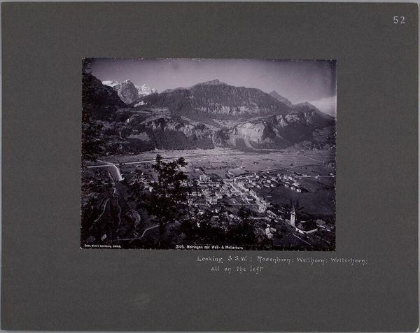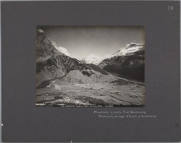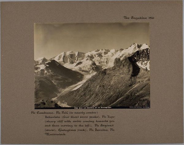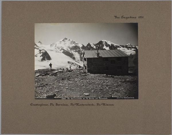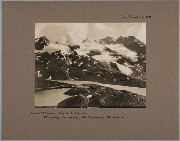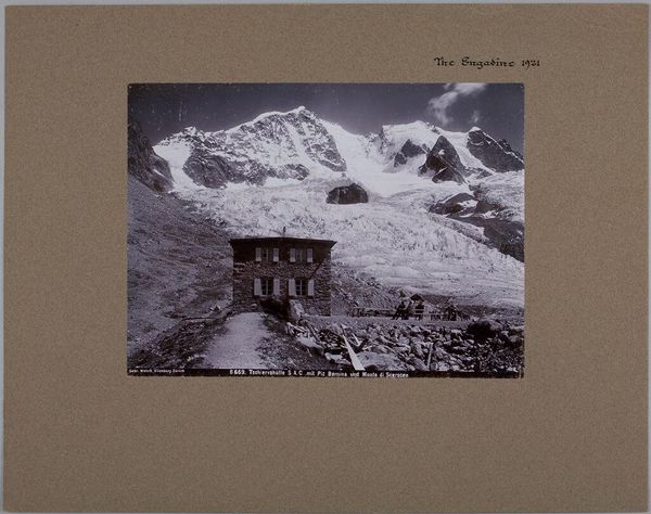 Curator: This photograph, titled "Kleine Scheidegg & Jungfrau," offers a glimpse into the Swiss Alps through the lens of A. G. Wehrli. Editor: Immediately, I'm struck by the imposing scale. The mountains absolutely dwarf the buildings, creating a feeling of isolation. Curator: Indeed. This work, now residing at the Harvard Art Museums, presents an interesting perspective on how landscape photography captures the human relationship with nature. Think of the rise of tourism in the area. Editor: Right, so it’s not just about the sublime, untouched wilderness, but about framing that experience for others. It's quite a stark contrast of human intervention versus untouched majesty. Curator: It certainly invites reflection on that balance. Editor: A powerful reminder of how we shape, and are shaped by, our environment.