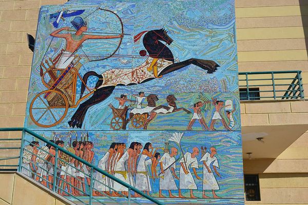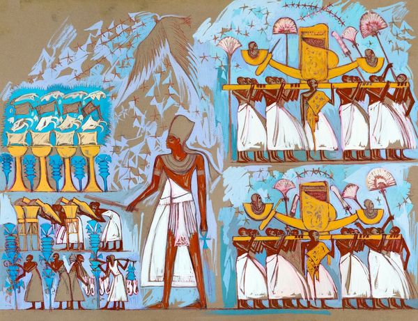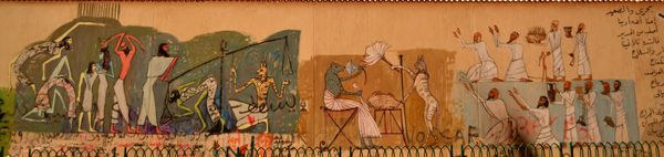 Alaa Awad's mural, *Memorial for Maat,* is painted directly onto a wall, and it vibrates with the energy of a bold, linear style. It's all about the immediacy, the artist letting loose with a confident hand, not fussing over details but letting the forms emerge through the act of painting itself. The color palette is both earthy and electric. Notice the ochre and red of the figures against the watery blue ground. This creates a sense of depth and movement, like figures emerging from the mists of time. The texture is raw. You can see the strokes, the drips, the way the paint sits on the wall, each mark loaded with intention. That one leaping horse, frozen mid-stride, carries so much of the mural's weight and spirit. It's a testament to the enduring power of the past and its impact on the present, in conversation with artists like Faith Ringgold who similarly embrace the cultural richness of the past to make sense of the present. Art, like memory, is never truly finished, but is instead an ongoing layering of experience.