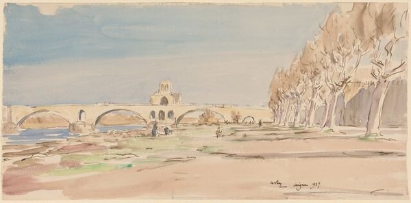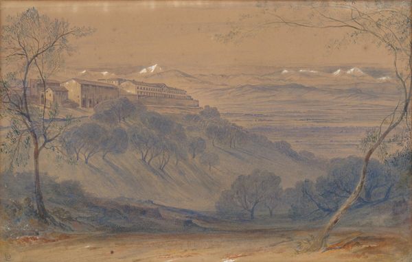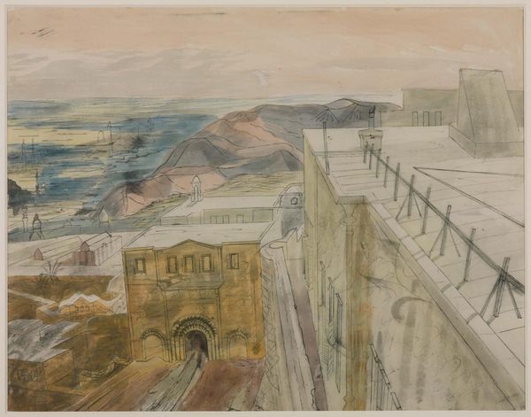 Curator: This is "Provence" by Charles M. Gere. Editor: My initial reaction is that the color palette evokes a sense of serenity, yet the imposing architecture suggests a somber atmosphere. Curator: The artist utilizes a limited range of pale colors to articulate form. Notice how the composition is structured around the central hilltop castle. Editor: Yes, the castle seems to be a visual representation of power and endurance. Perhaps an allusion to the region's rich history as a cultural crossroads. Curator: The delicate brushwork creates an interesting contrast with the solid geometry of the buildings. Editor: It certainly captures the spirit of Provence—a place where the past and present coexist. It leaves a lasting impression, doesn't it? Curator: Indeed, a work where every element carefully balances each other, giving this piece a remarkable stillness.