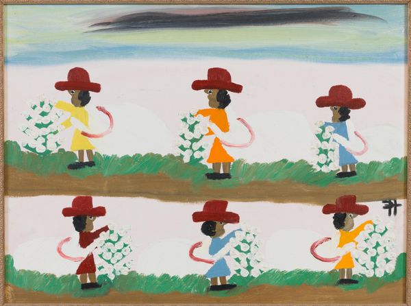 Curator: Here we have Clementine Hunter's "Going to Church (Melrose Plantation)." Hunter, born in Louisiana in 1886, painted scenes of plantation life from memory using simple forms and vibrant colors. Editor: It's like looking into a dream; the figures feel both familiar and otherworldly. The colors are so bold, they practically hum! Curator: Hunter's work is significant as an example of self-taught art that captures the cultural experiences of the rural South. The figures walking toward the church embody community and faith. Editor: I love how she represents everyone in their Sunday best. It makes me wonder what stories each character holds, and I can almost hear the gospel music echoing through the fields. Curator: Indeed, the artwork challenges the power structures and visibility within the history of American art, especially for Black women in the 20th century. Editor: Looking at this, I feel a warmth. It's simple, but incredibly heartfelt. Curator: Hunter's perspective offers unique insight, transforming everyday life into a testament of cultural memory. Editor: Absolutely. It's a reminder of the power of storytelling through art.
