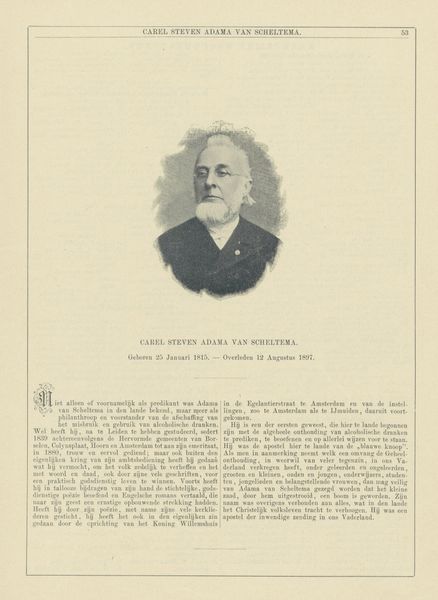 Curator: This is a print featuring "Portret van Johannes Gerhardus Rijk Acquoy," dating roughly from 1896 to 1949. It’s an engraving on paper, seemingly after an earlier photograph. Editor: My first thought is 'austere'. There's a real sense of formality to this portrait. The tones are muted and the lines of the engraving give it a somewhat serious and stately demeanor. Curator: I'd agree. Acquoy was a Dutch theologian and church historian, born in 1829. Knowing this definitely informs how we perceive the image. Notice how the engraving mimics the style of older etchings or even woodcuts; It's a nod to tradition, visually connecting Acquoy to a longer line of scholars and religious figures. Editor: So, even the choice of technique is purposeful in associating him with learned and established men of the cloth. I can imagine this type of portrait being widely circulated, affirming his status in religious circles. Were prints like these often produced after photographs at this time? Curator: Absolutely. Photography became a dominant force for portraiture, but older printmaking methods retained cultural value. Mass reproduction allowed his image to proliferate in a way paintings never could. But this isn't just about documentary; it is about cultural memory, the construction of a historical figure for public consumption. He seems consciously styled in ways that would make him legible and relatable for contemporaries. Editor: It also touches on something interesting: How we memorialize people, both through image and text. Here is this almost spectral representation coupled with a biography beneath the image… It almost becomes an artifact. It's fascinating how a seemingly simple portrait can carry so much socio-historical weight. Curator: Exactly. We're not just looking at a face but encountering the weight of institutional history, theological lineage, and even the early intersections of photography and printmaking in shaping public figures. Editor: I’ll definitely view engravings differently after this! It's really an intricate weave of artistry, biography, and social context. Curator: Yes, an image pregnant with the values of a certain time!