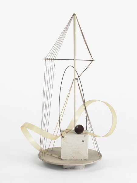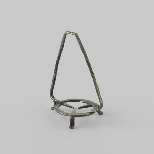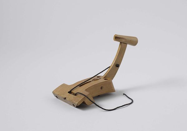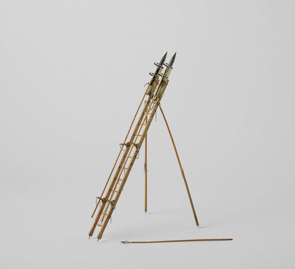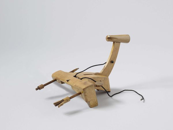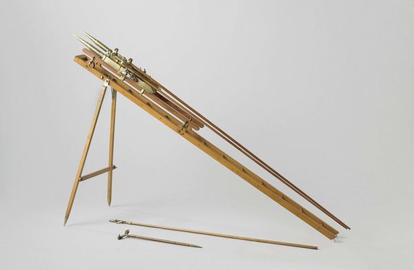 Curator: I’m struck by the inherent tension in this sculpture—a machine designed for compression, made delicate, almost vulnerable, in miniature. Editor: Exactly! Let's unpack that. We’re looking at "Model of a Pile Driver" created in 1855 by Petrus van der Loo. Constructed with wood and metal, it reflects a period of immense industrial advancement and, I think, the societal anxieties intertwined with it. Curator: Anxieties? To me, the emphasis lies in its geometric purity—the compelling interplay of line, plane, and negative space. Consider how the bare materiality elevates its function. The structure stands naked for us, highlighting the machine's abstract aesthetic qualities, rather than celebrating labor or engineering. Editor: But it's impossible to separate that aesthetic from its historical role! The mid-19th century was marked by monumental construction projects—railways, bridges—often fueled by exploited labor and exacerbating existing class divisions. Doesn't the model inadvertently comment on this dynamic? It reduces the brutal, messy reality of industrial labor to this pristine, manageable form. A kind of bourgeois taming of the worker. Curator: I appreciate your sociopolitical interpretation; however, consider how the artist directs our gaze. The model is rendered almost diagrammatic; the use of primary shapes gives order, rhythm, clarity. Notice that diagonal thrust of the pile driver itself. It embodies function in such an elegant manner. This is less about social realism and more about revealing the essential geometry of mechanical power. Editor: Perhaps. Though it strikes me that there is a disturbing detachment in isolating the elegance from the very real societal impact of these machines. This model also reminds us that these feats were enabled at an immense cost to both human rights and the environment. It prompts difficult questions about who profited, who suffered, and the legacies that remain. Curator: I’ll concede that van der Loo's design provides fertile ground for discourse. This highlights just how multifaceted an object it truly is. Editor: Precisely. It's through grappling with those contradictions that art can spark new understandings.