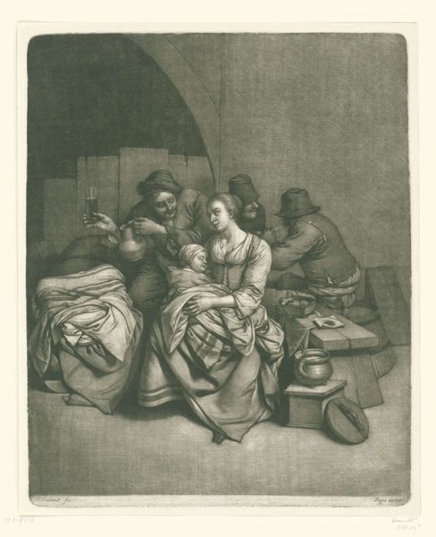 Editor: Here we have Jan van Somer's "A Soldier and a Woman," likely made somewhere between 1655 and 1700. It's a print, combining etching and lithography, I believe. There’s something quite melancholic about this scene… or perhaps it’s the soft rendering. How would you interpret the interaction between these two characters? Curator: Ah, a lovely scene, isn't it? You’re right to sense that somberness. Perhaps, rather than outright melancholy, I see… resignation? Observe how their hands meet – a tentative connection over what seems to be a shared drink. But their eyes, though, tell different stories. His are direct, almost challenging. Hers, averted, burdened. The dim light doesn’t just illuminate them, it almost weighs them down, don't you think? Editor: Yes, weighted is a good word for it. Like this isn't some lighthearted tavern scene, but something heavier. The setting is simple, almost bleak. It all hints at…consequences, maybe? Curator: Precisely! It's like peering into a private drama unfolding. A baroque miniature capturing an un-heroic moment. Are they lovers? Parting ways? Connected by shared burdens? We, like subtle voyeurs, can only piece together fragments. Does that ambiguity bother you, or does it draw you closer? Editor: Initially, it was frustrating, not knowing! But now, thinking about it, it's like a glimpse into a world; enough detail to get a feeling, but vague enough to keep my mind curious, imagining scenarios... Curator: Exactly! Somer gifts us an open-ended story. There's power in that restraint, inviting our own interpretations. It ceases to be just their story and subtly becomes ours. Editor: It’s funny – I came in expecting a historical snapshot, but it feels surprisingly…current. Almost like a page torn from a novel yet to be written. I might start writing that novel right now!