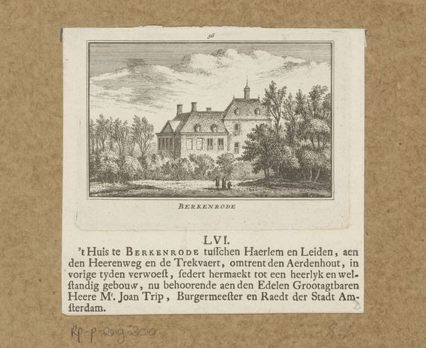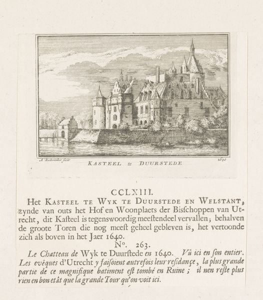 Editor: So, here we have "Gezicht op Huis Kronenburg," a print from 1725 by Abraham Rademaker, currently housed at the Rijksmuseum. Looking at it, I'm immediately struck by how serene the scene is, despite the castle showing signs of damage. What do you see in this piece? Curator: Oh, this one always gets me. It’s more than just a record of a building; it’s a whisper from the past, wouldn't you say? Notice the detailed engraving – Rademaker truly captured the stillness of a world touched by conflict. But there’s this…gentle melancholy, almost a quiet acceptance. You get the feeling that the building almost 'mourns' the impact of French aggression. What do you imagine it might have looked like beforehand? Editor: Possibly grander, less worn? Almost… idealized, maybe? Curator: Perhaps, and it's interesting to me because this almost 'neutral' approach actually amplifies the story. Rademaker isn’t preaching, nor glorifying battle or conquest; but he offers an honest moment in time and suggests its own kind of meaning. Can you feel its 'weight?' It seems to say that scars can fade. But aren't they worth remembering? Editor: It does make you think about the long arc of history, how things change and yet…still remain. The ruins tell a story beyond the aesthetic appeal of the work itself. Curator: Exactly! And the quiet figures near the building, nearly consumed by the scene, speak to the people’s perseverance, how life carries on regardless. Isn’t it nice how the artwork creates a kind of meditative space? Editor: It really is, seeing history captured with such nuance – it gives a fresh, more thoughtful, perspective on this Baroque style. Thanks! Curator: My pleasure, thinking about it this way just…softens its blow. Gives it the sense of something you can be okay with again, doesn’t it?