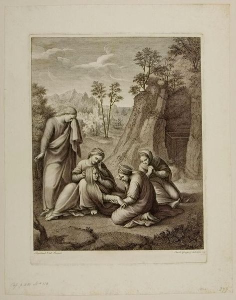 Editor: This is Jean Charles Flipart’s "Christ in the Garden of Olives." I’m struck by how the figures seem almost suspended in the silvery light. What do you see in the composition that stands out? Curator: The engraving's formal structure presents a compelling study in contrasts. Notice how the artist balances the verticality of Christ's prayer with the horizontality of the sleeping figures, creating a dynamic tension within the pictorial space. Consider also how the monochromatic palette emphasizes line and form. Editor: That's fascinating; I hadn't considered the interplay of vertical and horizontal lines so deliberately. Curator: Indeed. And how does the artist’s precise control of line weight contribute to your reading of the emotional tenor? Editor: It's all so intentional, isn't it? I see now how every formal element shapes the narrative. Curator: Precisely. Through rigorous analysis, we begin to decode the artwork's intrinsic meaning.