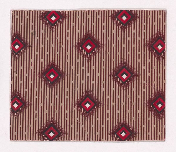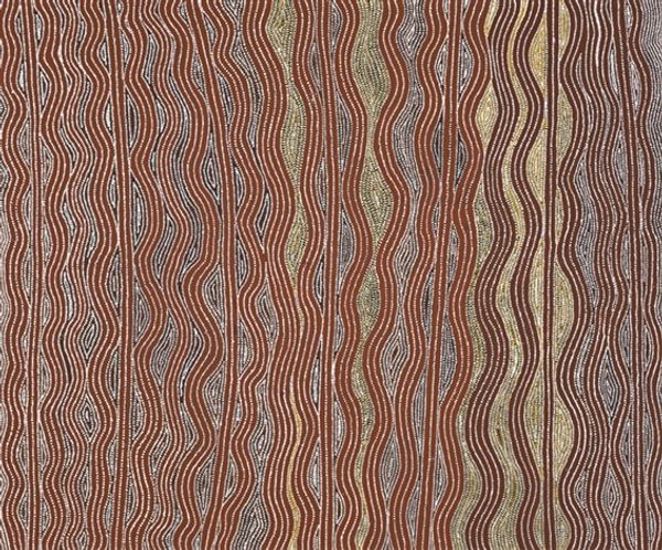 Editor: This is an acrylic painting titled "Untitled" by Warlimpirrnga Tjapaltjarri, created in 2001. It immediately strikes me with its mesmerizing rhythm of vertical lines. What can you tell me about this work? Curator: It *is* hypnotic, isn’t it? To me, it feels like water rippling, or perhaps the memory of a sand dune after a strong wind. The painting invites contemplation. What do you think is behind his choice to repeat these simple shapes, these elegant curves? Editor: I’m thinking about Indigenous art more generally. It often tells a story. Curator: Exactly! Many Indigenous Australian artworks operate on multiple levels. Superficially, they’re beautiful abstractions – like we see here. But they also encode narratives, sacred knowledge relating to the land, ancestral stories or 'Dreamings.' With Warlimpirrnga, consider that he’s a Pintupi man and one of the last Aboriginal people to come into contact with European society, only around 1984. Editor: Wow, so he’s bringing with him a completely different history, experience... Does the red background have a specific significance? Curator: In Western Desert art, earthy tones reference the landscape itself. Red ochre, in particular, has deep symbolic resonance, connecting to the land and to ceremony. I wonder if the painting becomes more than abstraction at that point. A symbolic document? What do you think? Editor: Definitely. It's made me think about how art can be a living map of a cultural heritage. Curator: It is, isn't it? A kind of beautiful secret, whispered through generations. I love the idea that even an abstract painting can be profoundly connected to the earth and history.