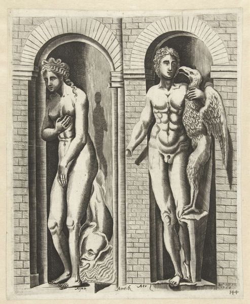 Curator: This print, "Les divers pourtraicts et figures IV", comes to us from Master AD around the year 1600. It is an engraving demonstrating the heights of Mannerist style. What is your initial impression? Editor: A procession of myth and flesh, certainly, but also of disproportion. Look at the sizes of those heads compared to their bodies! There's an anxious quality too, with all of those gesturing hands. Curator: Note how the artist arranges nude figures within a series of arches, creating a visual rhythm. The bodies are highly stylized, their forms elongated and musculature emphasized, typical characteristics of Mannerism. We must consider also the graphic texture: look at the varying densities of line. What meanings do you find within those elements? Editor: I see symbols aplenty. Each figure bears what appears to be an attribute or totemic object--a club, fruit, and, most strikingly, birds clutched above heads. Are these depictions of primordial rites? Fertility celebrations, perhaps? There's a frenzied quality which suggests ecstatic ritual. Curator: Quite possibly. These items direct us through each of the frames and across the whole composition, which brings to mind contemporary theories of complex design meant to be solved with close looking. Consider how the negative space functions almost as an element on par with the forms. Editor: The children certainly amplify the reading of something ceremonial--childlike figures in these scenes usually add connotations of initiation or sacrifice. A story unfolds between the arches. The poses almost hint at dance. Curator: A type of sacred choreography, certainly. We must not disregard the composition of this work. Observe how line directs the eye through the piece and how this linearity affects the work's reception. Editor: It gives one much to consider, certainly. The enduring power of visual symbols continues to fascinate! Curator: Agreed. Indeed, observing the piece at a deeper level lets us truly admire how form manifests into visual poetics.
