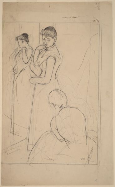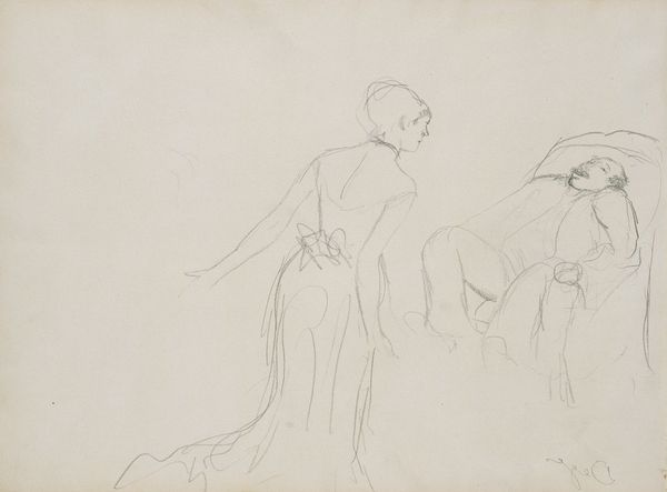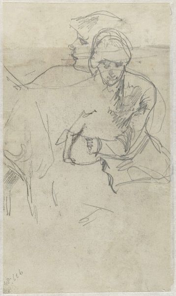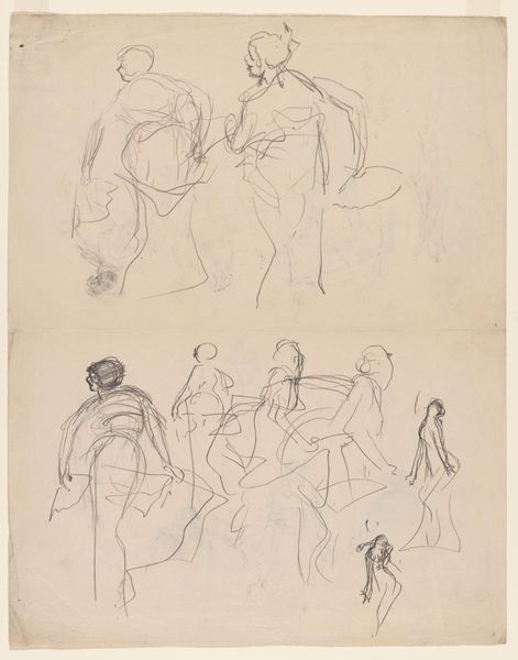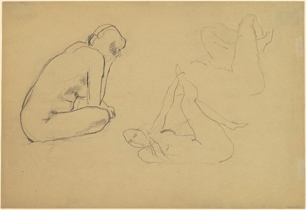 Curator: Mark Rothko's Studies of a Seated Figure Using a Hammer presents us with two separate pencil sketches of figures captured in apparent labour. Editor: The image is haunting, like looking at ghosts caught mid-action. The sketchy lines create a sense of impermanence. Are they building something, or demolishing? The ambiguity feels loaded, socially and politically. Curator: These images immediately convey physical effort, a universal element of our experience that speaks volumes. The figures themselves, caught with deft strokes, almost echo Cycladic figurines—simplified yet full of implied strength. Look at the symbolism of labour, power, creation. Rothko perhaps seeks to reveal elemental human processes? Editor: I read it as more loaded than elemental, perhaps reflective of the societal positioning of laborers in that time. The unseen conditions, the lack of specificity regarding gender, or background—that creates a haunting void. Rothko seems to ask, who is allowed to build, and at what cost? Are they victims of capital or its very engines? Curator: I can see that. Consider the hammer; throughout history, it has been a symbol not only of making but of revolution, of tearing down the old order. Its inclusion suggests an undercurrent of potential change, echoing earlier traditions depicting blacksmiths like Vulcan, a symbol of transformation through labor. The seated figures perhaps aren't just working but contemplating or embodying revolutionary energy. Editor: And I think situating this within Rothko's broader oeuvre is key. We understand his trajectory. It’s fascinating how he captured figuration at a certain time, then abandoned that for complete abstraction. Perhaps this piece sits right in that intersection—the figure becoming a shape of pure force or experience. Curator: The starkness really holds it together; these humble, spare strokes encapsulate powerful themes: manual work as burden, labor's symbolic potency, revolutionary potential, and enduring mystery. It truly encourages deeper thinking beyond the surface. Editor: Exactly. Looking at the act, the actor, and the history as well. A small image holds much and forces larger conversations, just like Rothko's more recognized later paintings.