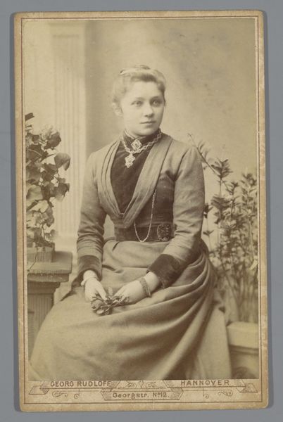 Curator: What an intriguing piece, this "Portrait of a Woman, Seen Through a Doorway," a gelatin-silver print by Albert Greiner, dating between 1861 and 1890. The Rijksmuseum holds it now, adding to our understanding of the era's visual culture. Editor: The oval framing feels almost like a window looking in. It creates a very intimate, almost voyeuristic experience, doesn't it? There’s a real sense of capturing a private moment. Curator: Indeed. These kinds of photographic portraits were increasingly democratized through the latter part of the 19th century. This portrait presents a formal representation within a constructed environment. Notice the pose and controlled expression—characteristic of portraiture designed for public or familiar consumption. Editor: But that doorway aspect... It disrupts the formality slightly. Is that symbolic, do you think? Is the doorway meant to suggest a transition, a glimpse into another world, or even just a peek behind social facades? Curator: That’s a potent reading. Remember that the burgeoning middle class wanted visual markers of their success and social standing, but at the same time, new photographic techniques were experimented with across Europe and this photo demonstrates an artistic impulse on top of that basic desire for self-representation. Editor: And I suppose the oval mat reinforces the sense of a treasured object. It’s contained, precious. There is also that gold detailing around the oval edges... Curator: It is reminiscent of lockets and brooches from the time and reinforces it as an object of private veneration in the wake of mourning rituals becoming more commonplace and photographic portraiture more accessible than painting. These were technologies intertwined. Editor: Ultimately, what strikes me is the mystery that this photo evokes. I'm curious about her inner world and story through that single, framed glimpse, rather than anything explicitly expressed. Curator: I concur; that subtle air of the unsaid might be one of the more compelling enduring legacies of this image; considering its production within the broader social dynamics allows us further insights. Editor: Seeing the picture and the historical context in tandem certainly helps you piece together what you're looking at. Thank you!