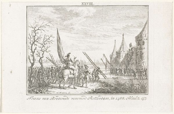 Simon Fokke made this print, "The Cod Ejected from Amsterdam," sometime in the 18th century, using etching. This process involves covering a metal plate with a waxy ground, scratching an image into it, and then submerging the plate in acid, which bites away the exposed lines. In this instance, etching allows for intricate detail, capturing the tension of a political event from centuries before Fokke's time. It shows the banishment of the "Kabeljauwen" or "Codfish," a political faction, from Amsterdam in 1444. Note how the method of production—etching—enables the widespread dissemination of this historical narrative. Prints like these were relatively inexpensive, a means of circulating stories and solidifying cultural memory in a growingly literate society. It’s important to remember that images like this reflect both artistic skill and broader forces of labor, politics, and consumption. The work’s value resides not only in its aesthetic qualities but also in its role as a historical artifact, shaped by and contributing to its time.
